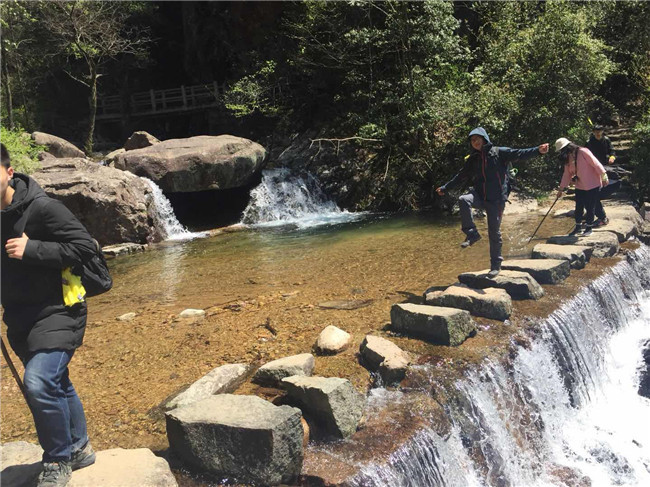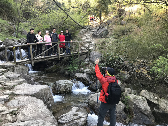 一路山花烂漫,笑声不断。泉水纵横,瀑布飞溅,攀石岩、惊心动魄,饮泉水,滴滴润喉。