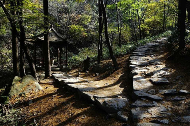 顺吴越古道石板路台阶而上,一路溪流陪伴,瀑布奏鸣,曲径通幽,跌宕起伏。