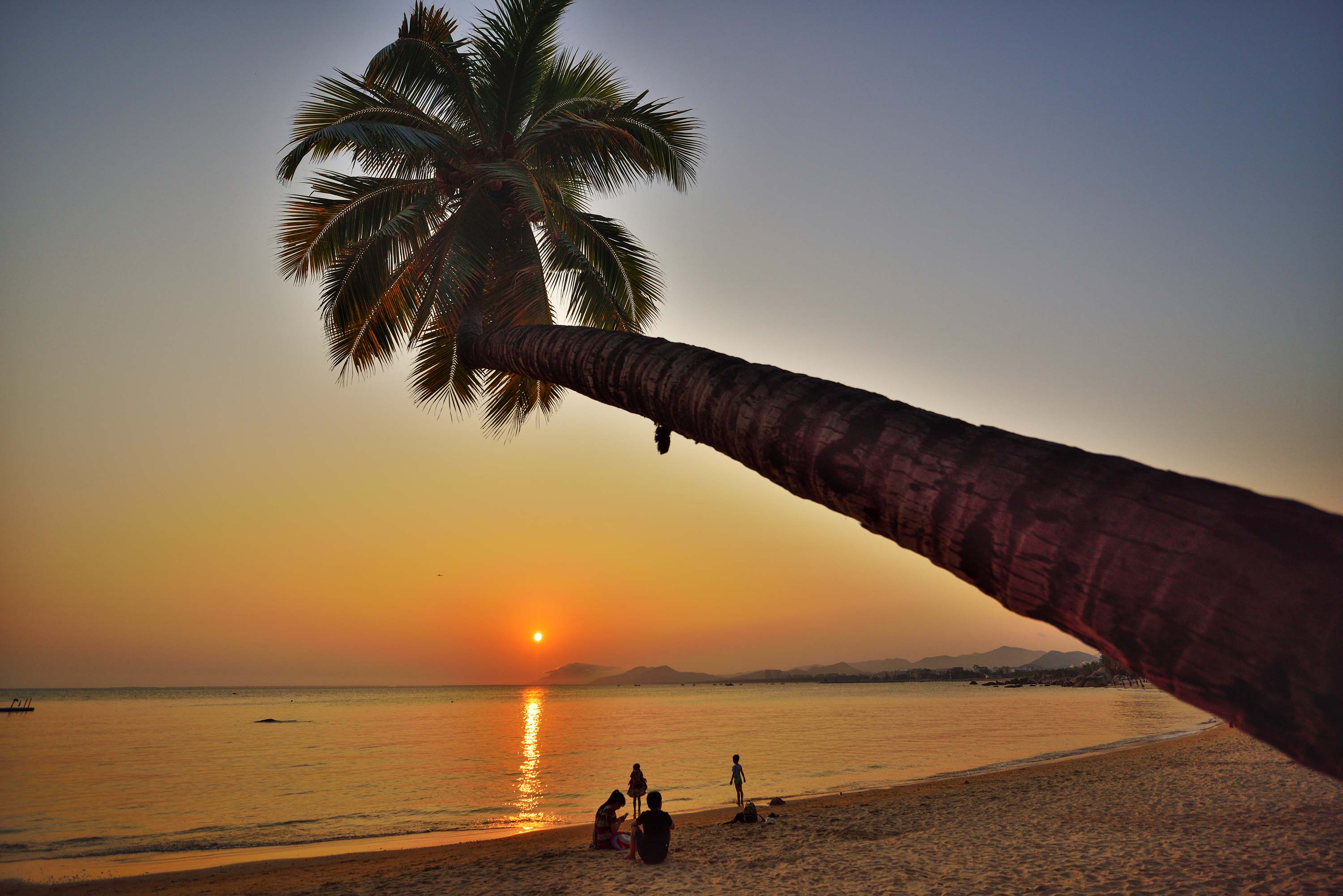 夕阳下,金海湾,远山在招手,椰树伸头看,天涯并不遥,海角也不远,这里四季如春天,懒得走,更留恋。