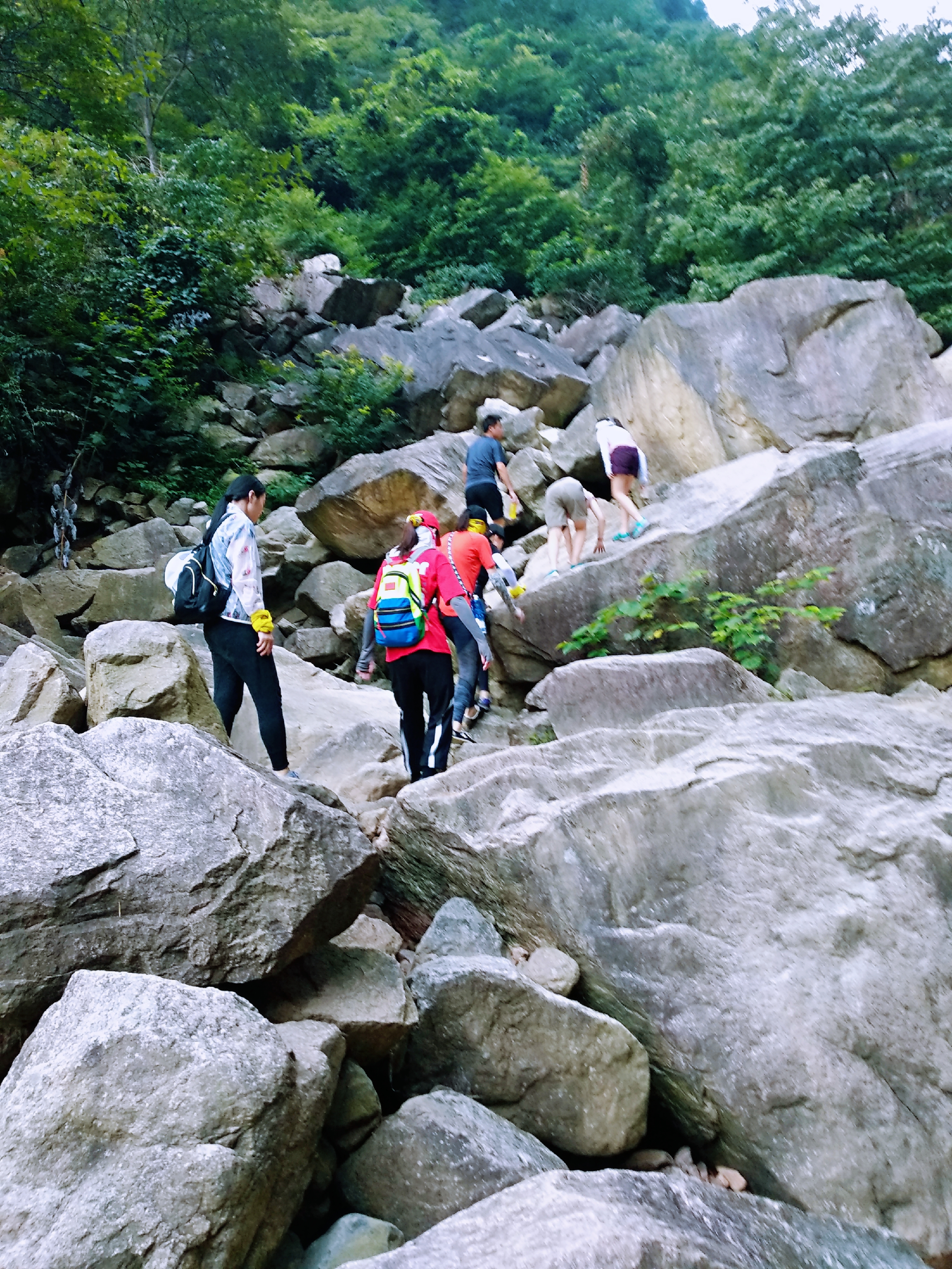 一小段山路之后,终于看到嶙峋怪石和涓涓细流,小伙伴们也就此开始趟水跨石的溯溪穿越之旅~~
