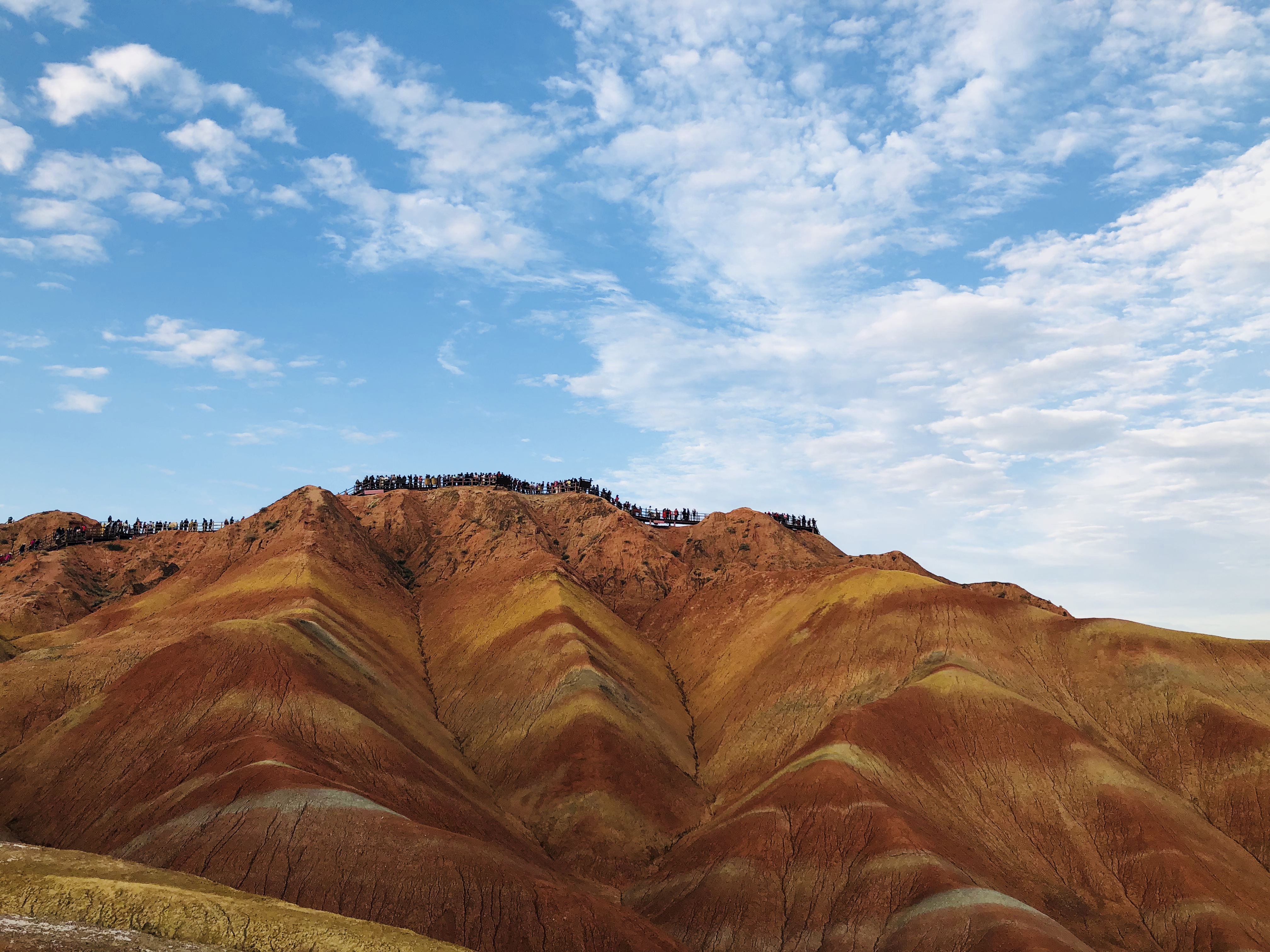 张掖丹霞国家地质公园,犹如上帝打翻的调色盘,红、紫、黄、绿、白、灰等色彩相互间杂,错落有致,不得不让人感叹于大自然的鬼斧神工。这个景点游侠客特意安排在傍晚时分进入景区,这无疑是一个非常正确的选择。当天云层较厚,整天都见不着太阳。然而大概下午45点,太阳终于不吝惜她的阳光,特地为我们奉上了一场精彩的落日秀。当我们游览至4号观景台(景色最为壮观的观景台)时,太阳正好落山。行程安排相当合理。