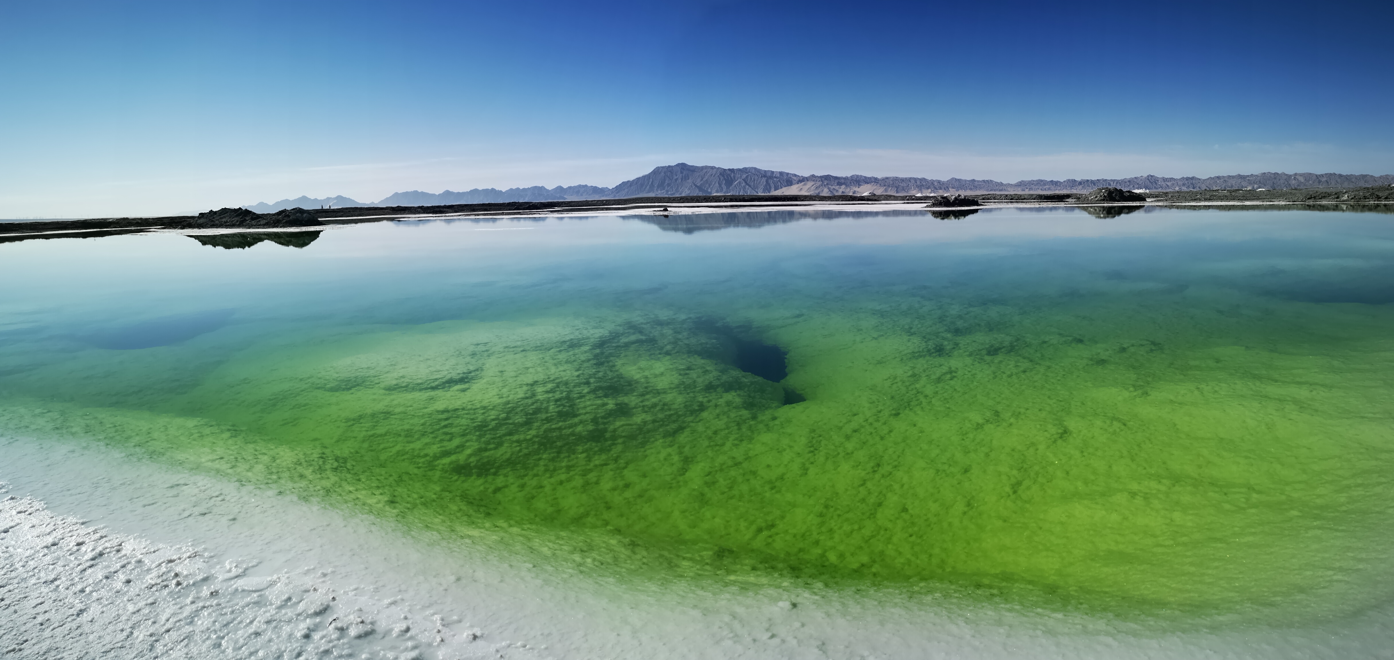 这片约6平方公里的“翡翠湖”是原大柴旦化工厂盐湖采矿队采矿区,伊克柴达木湖又名大柴旦湖,为盐湖,由于所含的矿物质浓度的不同,也就形成了颜色多彩的景象。