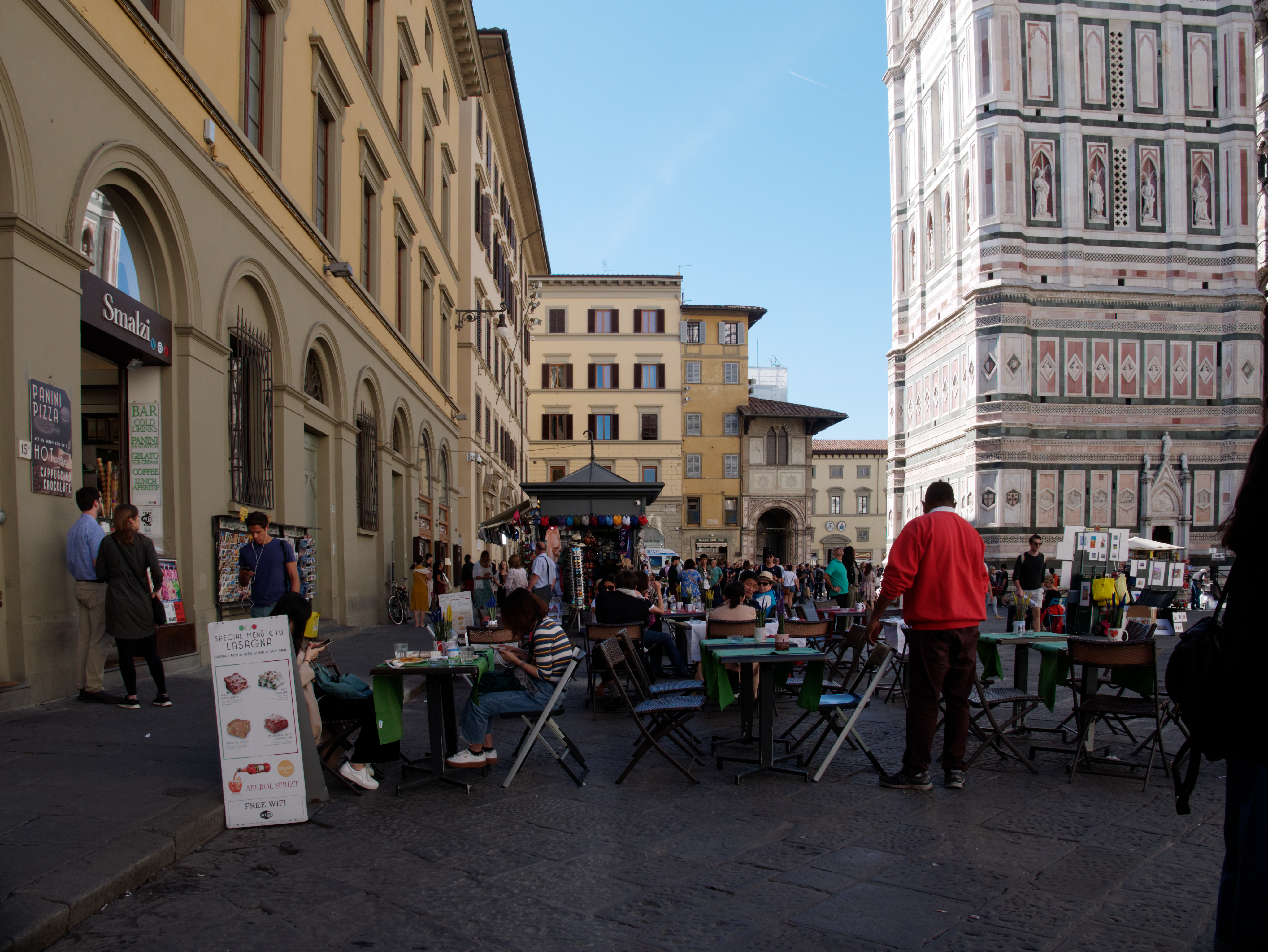 佛罗伦萨老城区,基本上都是小街小巷,宽点的也就能开一辆车,因为路窄两边的多层建筑显得尤为高耸。每栋老房子,每条砖石路,再加上到处都是的雕塑和教堂,仿佛整个小城都凝结在了文艺复兴时代。