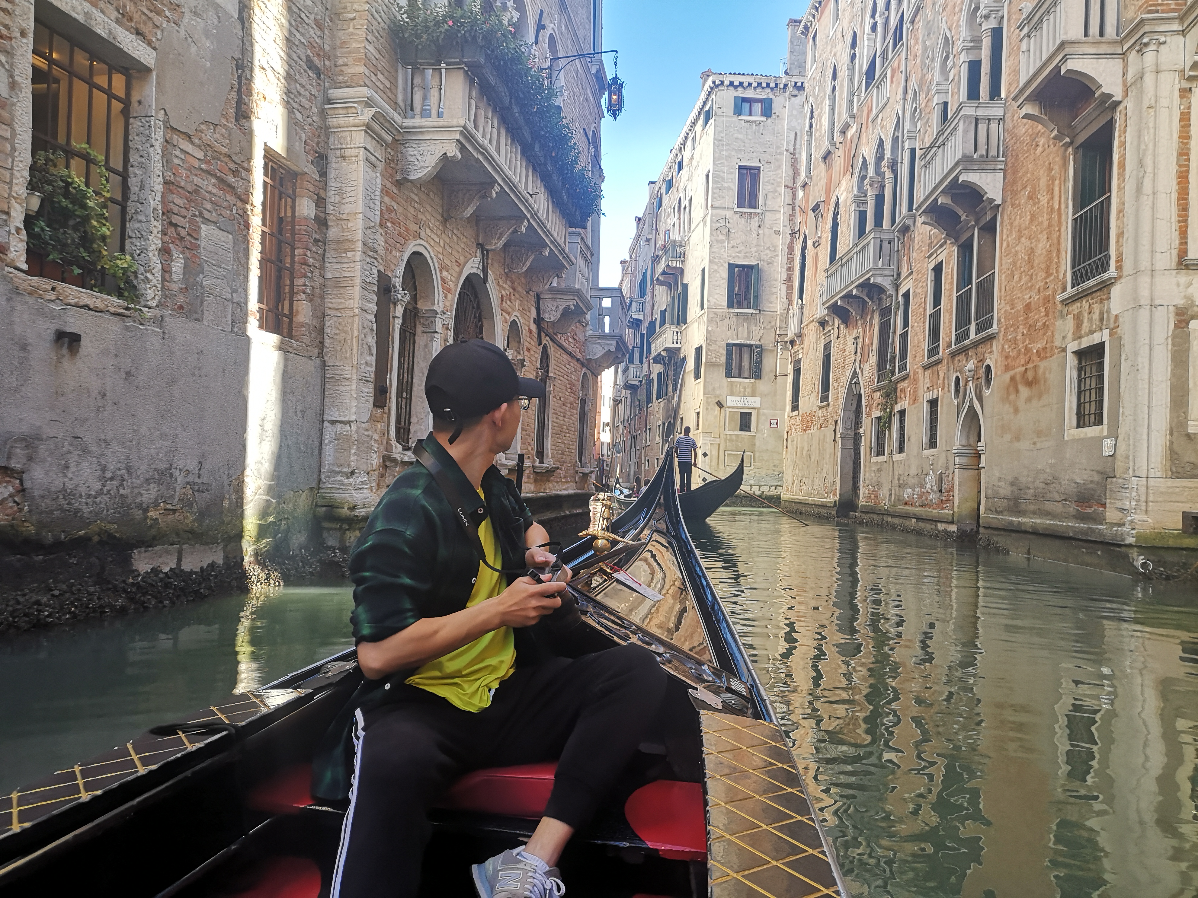 几位美女团友邀请我帮她们拍照,看她们在贡多拉上自拍打趣笑得很开心,午后的阳光照射在发梢显出金色的轮廓线,身后的船夫专注地划船,一切都如此美好自然。我于是顺手拍出了一张本游记最佳照片。