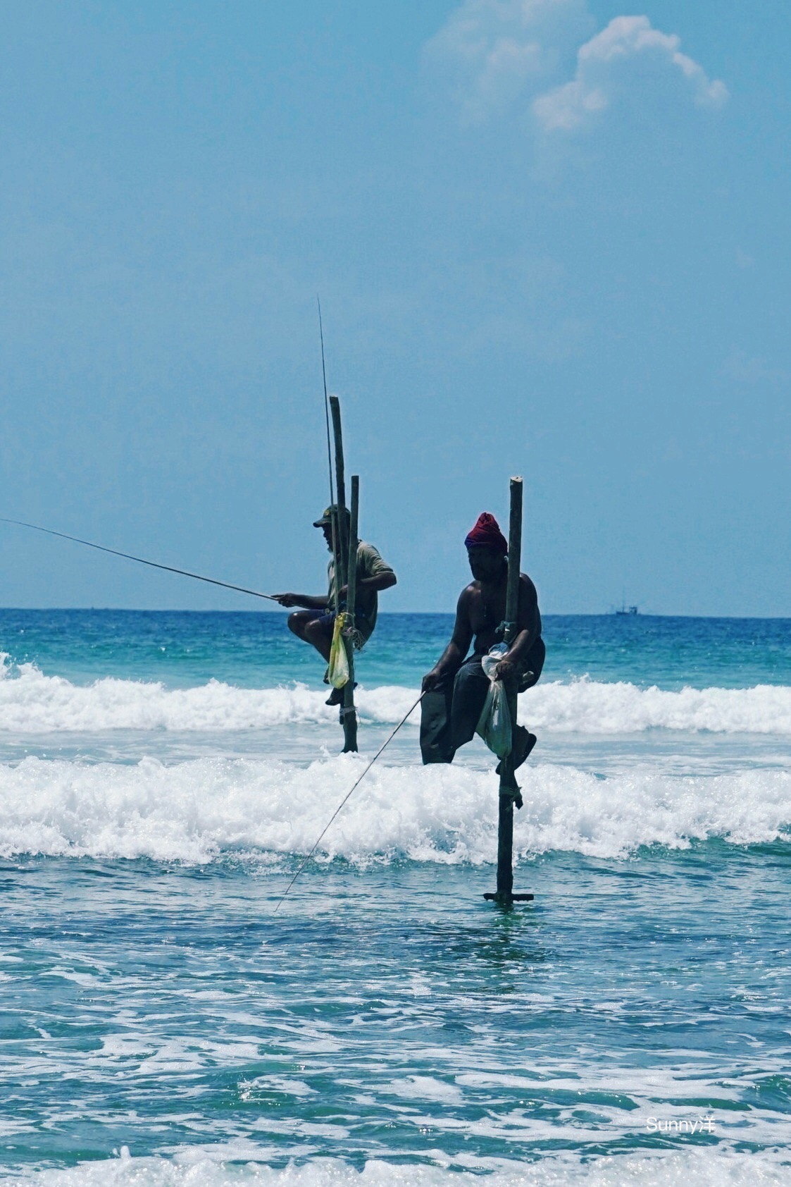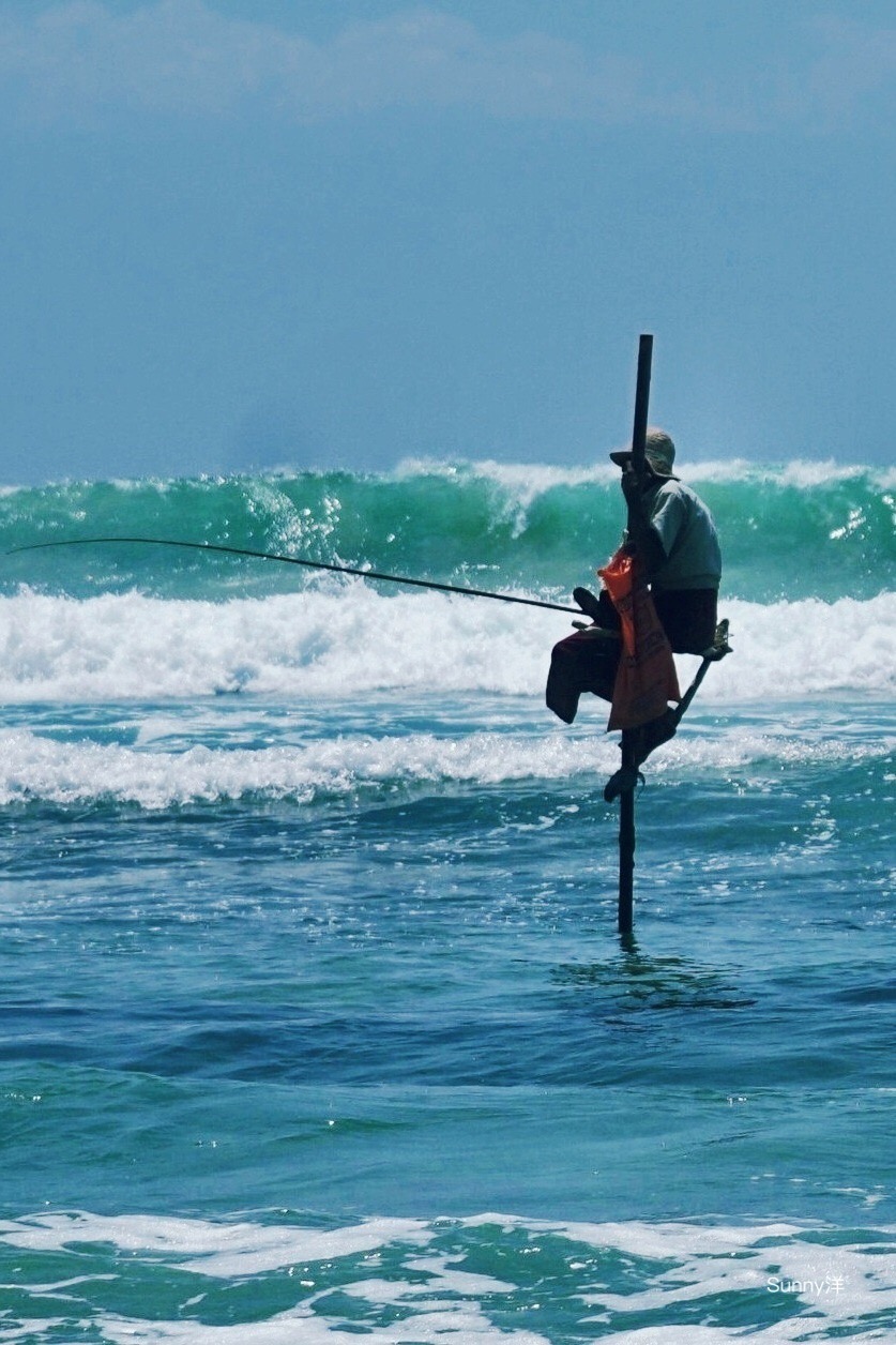锡兰祖祖辈辈都采用这种独特的捕鱼方式 曾经渔夫买不起船 就发明了踩着高跷捕鱼的方法 渔民基本就是涉水到达浸泡在海水中的木桩那里 爬上去 坐在简陋的木架上 架开鱼竿 接下来就是钓鱼时刻了 他们的目标就是大量游弋在浅海区的沙丁鱼 有时候运气好 每分钟都有鱼上钩 要知道他们的鱼竿可是没有鱼饵的 所以不得不称奇...