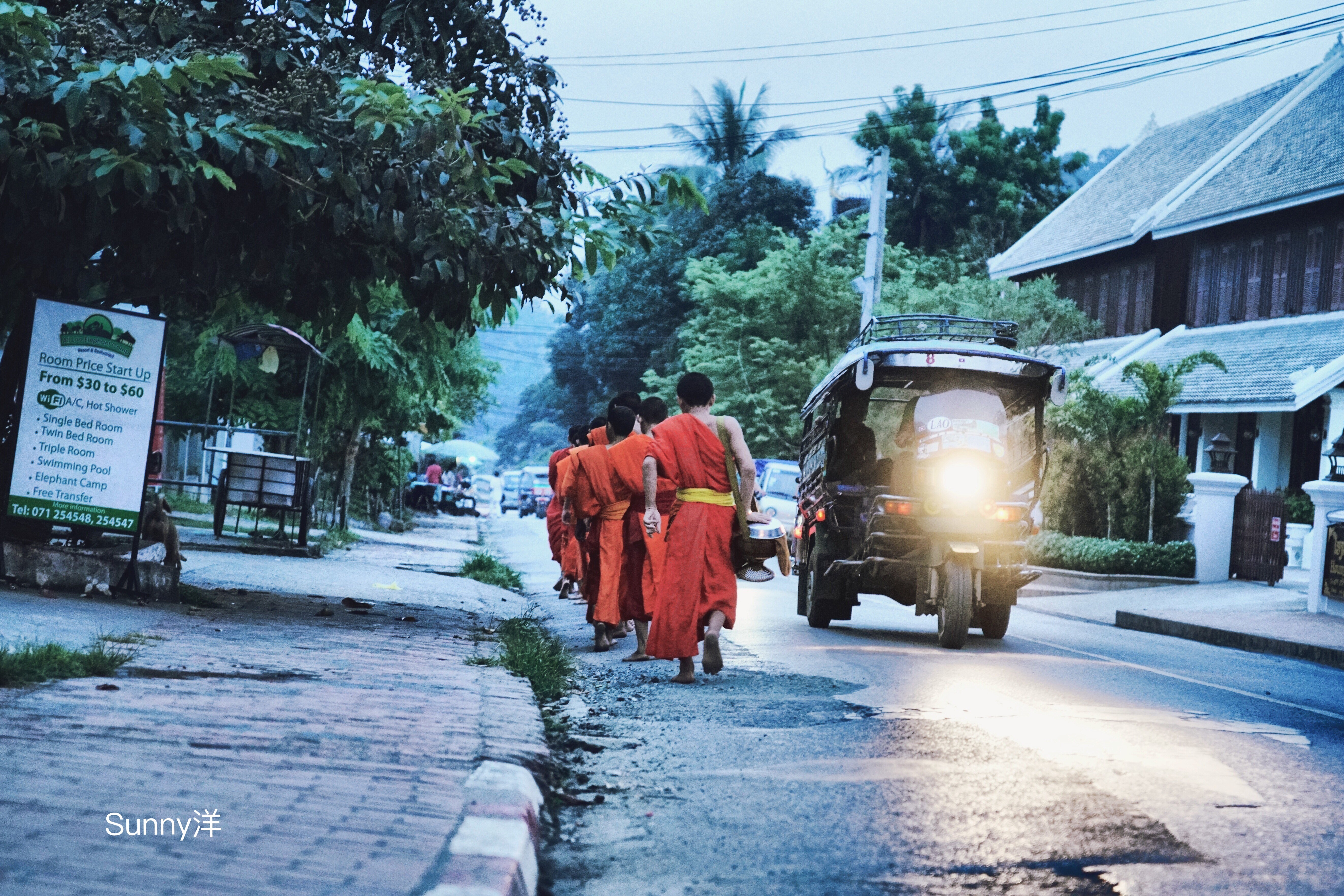 清晨太阳还没升起 妇人用竹篓装着热腾腾的糯米饭 盘坐在门口或寺庙口 点起蜡烛 虔等 静默祈福 僧人从远处走来 步伐匆忙 接受布施 回到寺里 太阳照常升起
