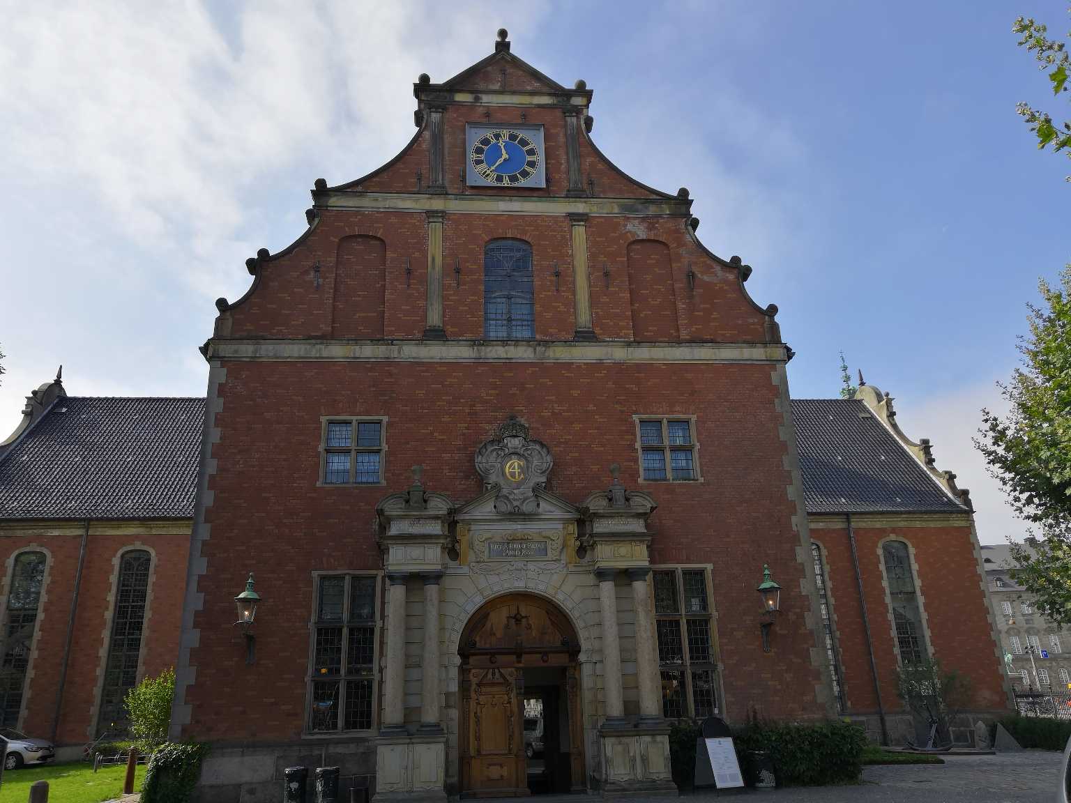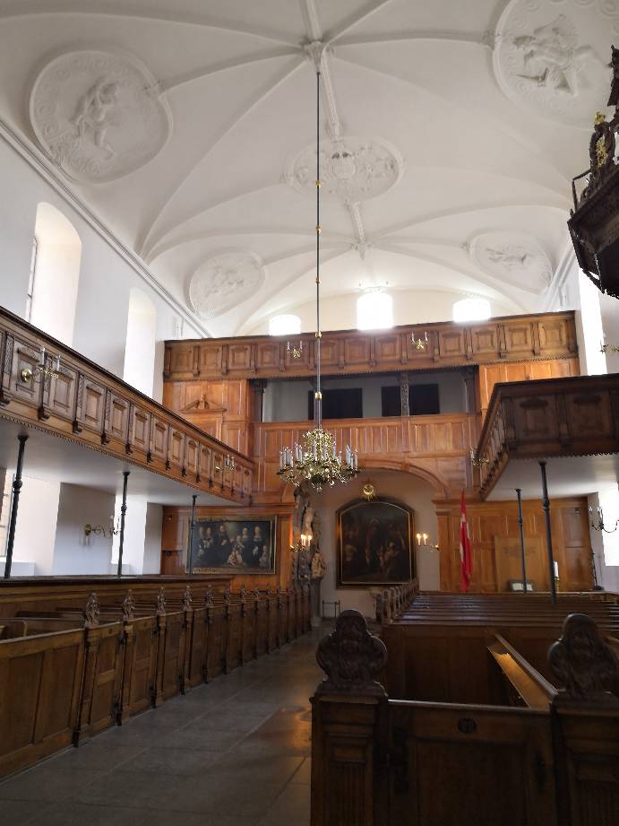 古股票交易所对面是小岛教堂,这里是现任丹麦女王大婚的地方,该教堂从高处看像十字架形状,红褐色的砖墙,黑瓦的屋顶,铜绿色的尖顶,造型优美,里面收藏了大量的绘画等艺术品。一开始我们只在门口拍拍看看,不敢进去,后来有几个欧美的游客进去了,我们也跟了进去,发现里面陈设很精美。感觉赚到了😀