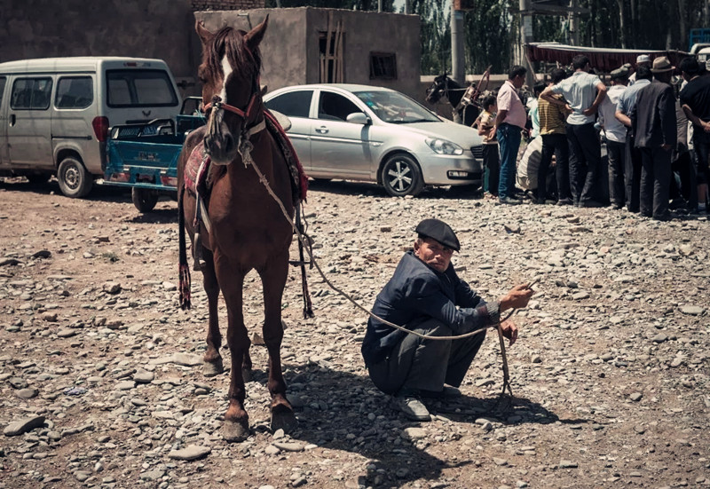 整个场面你用热闹,我觉得是沸腾一词更为恰当,牛羊驴骡的叫声,养殖户商贩餐馆个人来回走动,或焦虑,或喜悦,或张望,或坐卧,还有小巴郎与他家羊羊的不舍,俨然一副南疆独有的画卷。