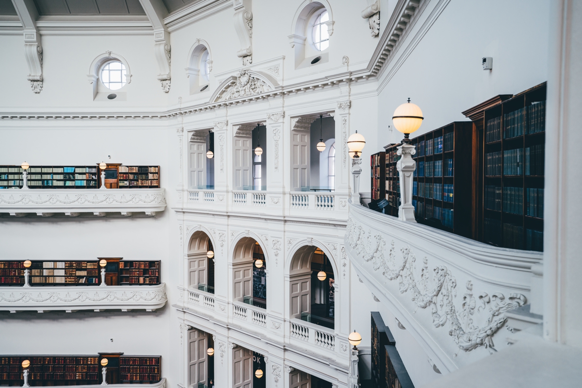 州立图书馆是免费开放的,依我看来,这里似乎已经成为网红打卡地的所在。图书馆最出名的地方就是高耸透亮的恢弘穹顶和底部八角形的格局——长长的木桌配上绿色的复古台灯,还真有些魔法学院阅览室的感觉。