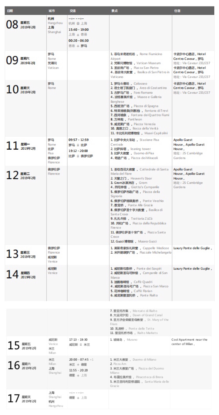 年前工作量大,经常加班到凌晨,所以这趟的行程攻略没有花太多的时间,导致在旅途中出了很多差错,最后悔的是没有进入米兰圣玛利亚感恩教堂看巨作《最后的晚餐》。庆幸我们出行在2月,意大利的淡季,其他的景点与博物馆排队也能进入,不用提前半个月预约!