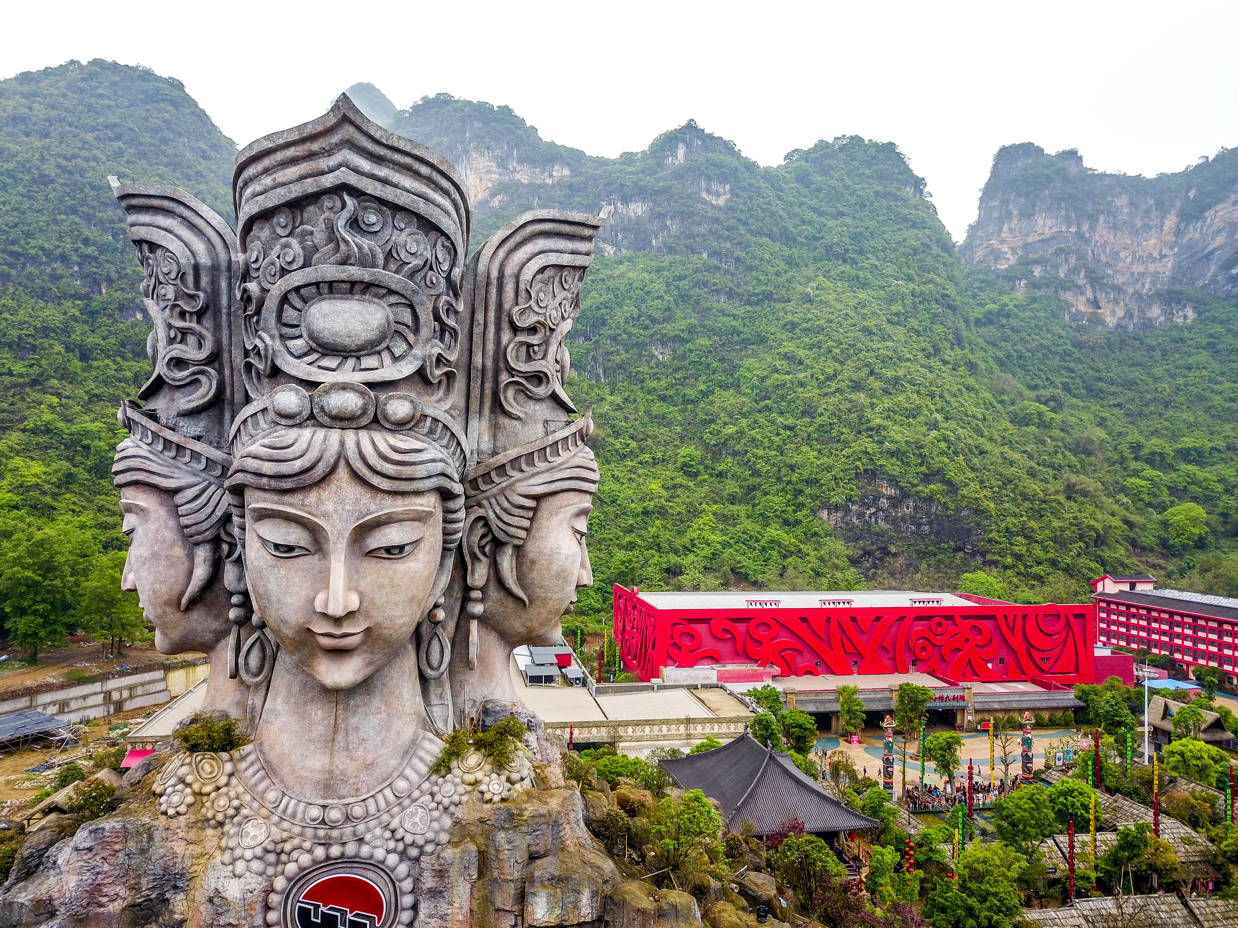从 阳朔 县城打车前往 桂林 千古情景区,距离还是很近,就是一个起步价就可以到了。刚下车,就看到了千古情标志性的大型雕塑了,感觉千古情景区都会有这个设计。但是 桂林 千古情的感觉是最美的。因为,这次的四面雕塑叫做歌仙造像,原型应该是刘三姐。