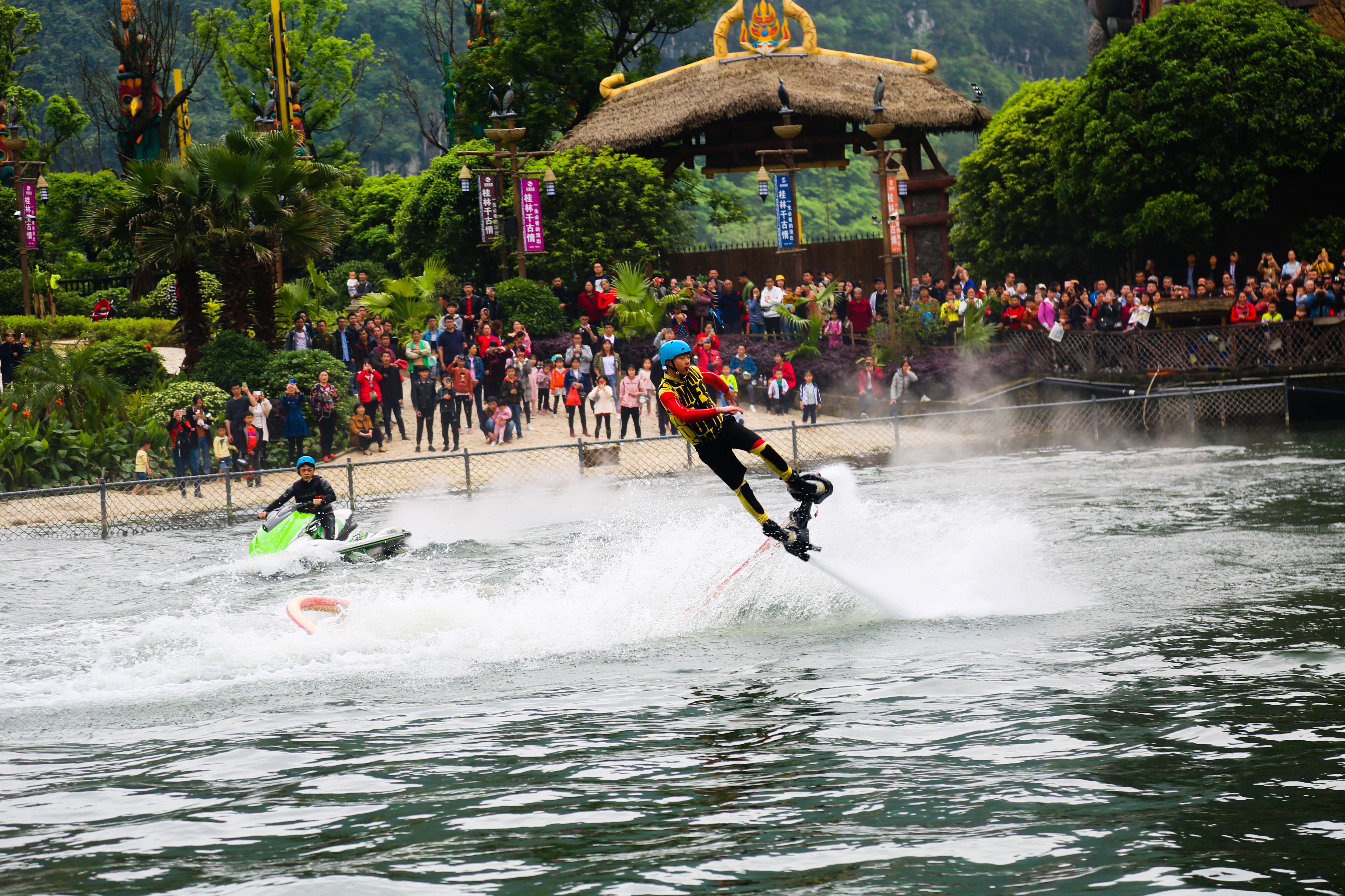 10分钟的水上飞人表演,两个演员卖力的为在场所有的游客,呈现了精彩绝伦的表演秀。一名演员利用脚上喷水装置产生的反冲动力,让他可以在水面之上腾空而起,另外 一名演员驾驶摩托艇,控制水量。两名演员天衣无缝的配合,让他仿佛一个“超人”,在水中自由行走。