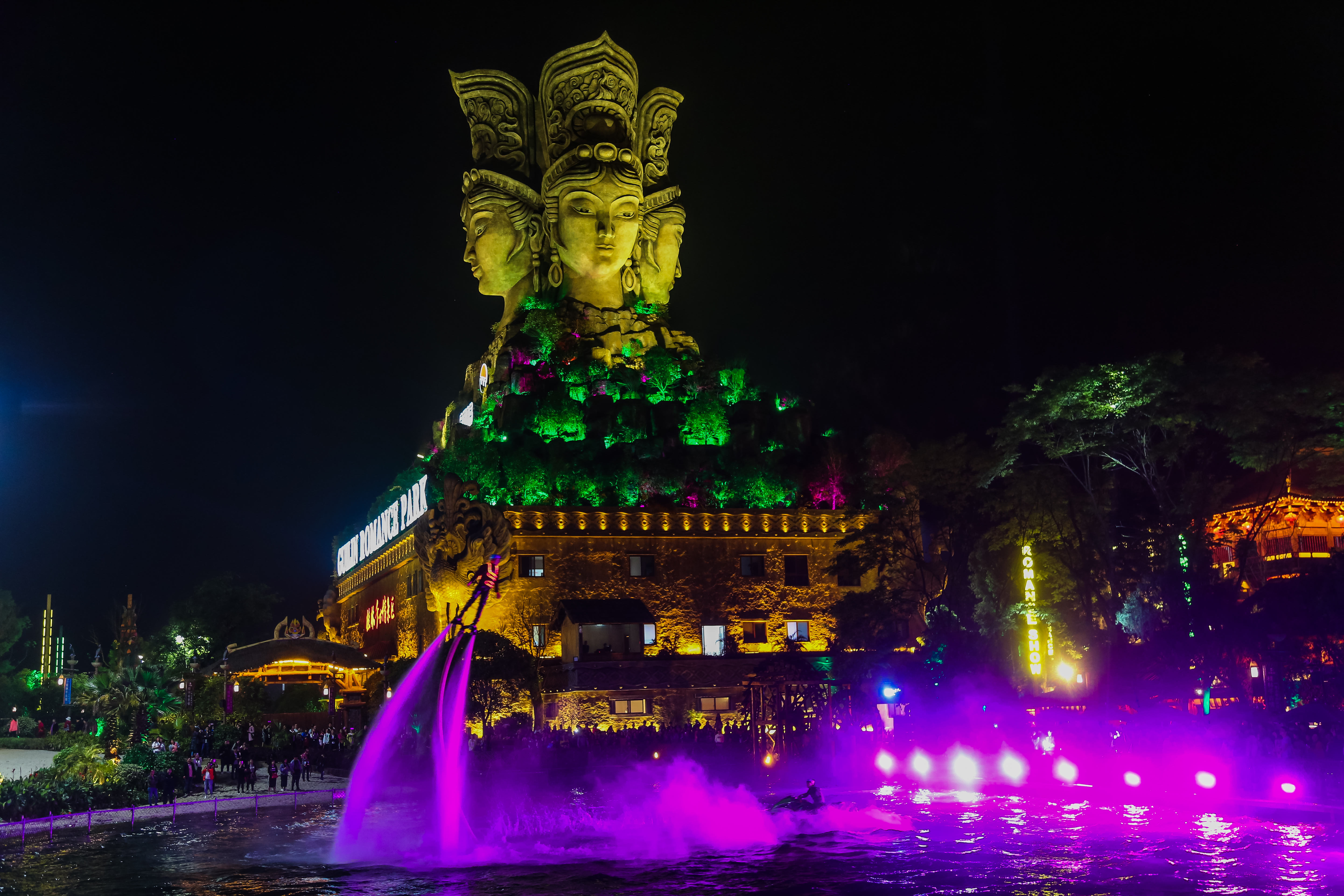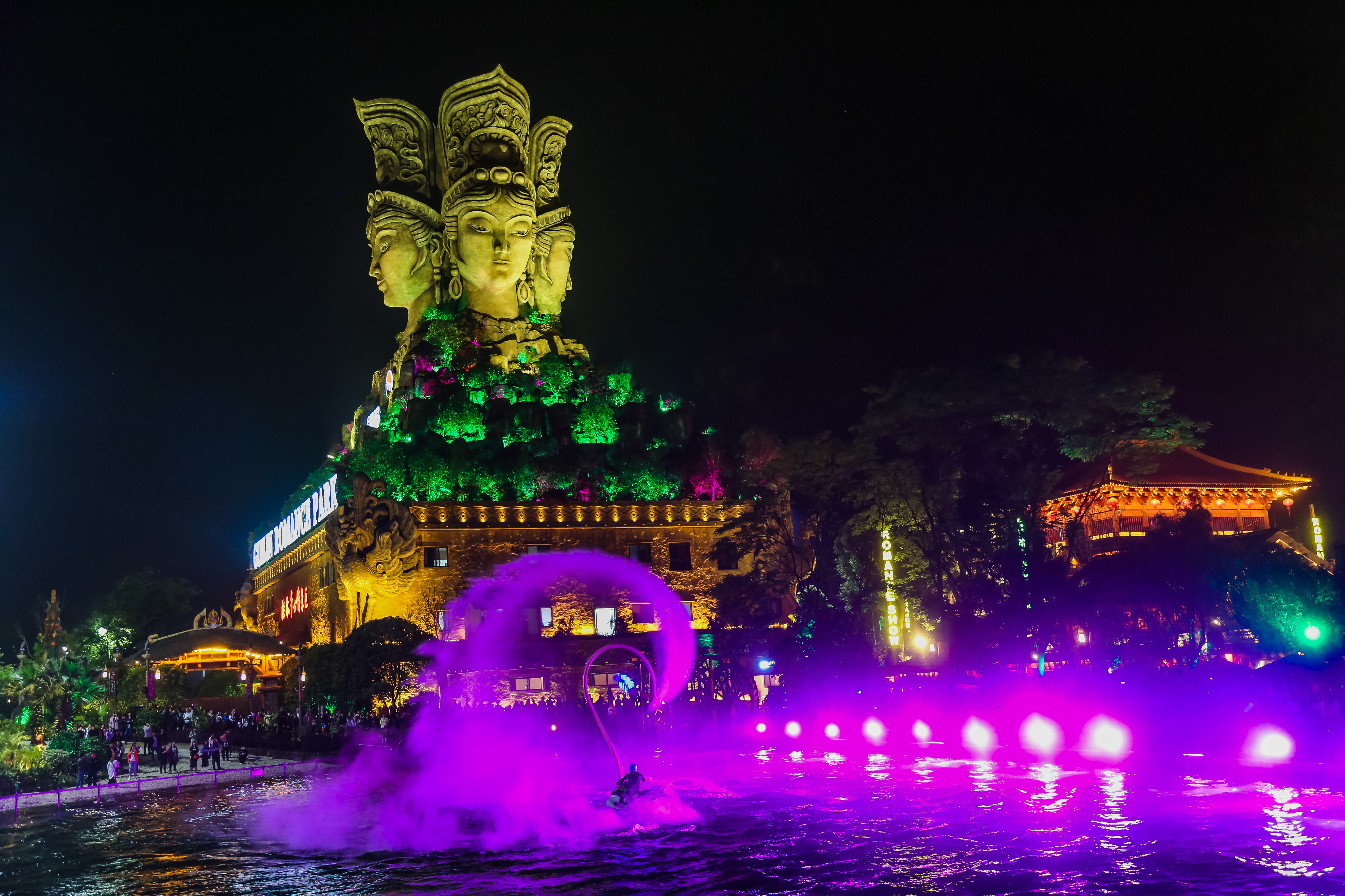 看完民族快闪秀,另外一场精彩的表演,在4号海湾,水上飞人也上场了。4号海湾也是景区内唯一的一片水域,还做了人造的沙滩,营造出一片海滩的既视感。
