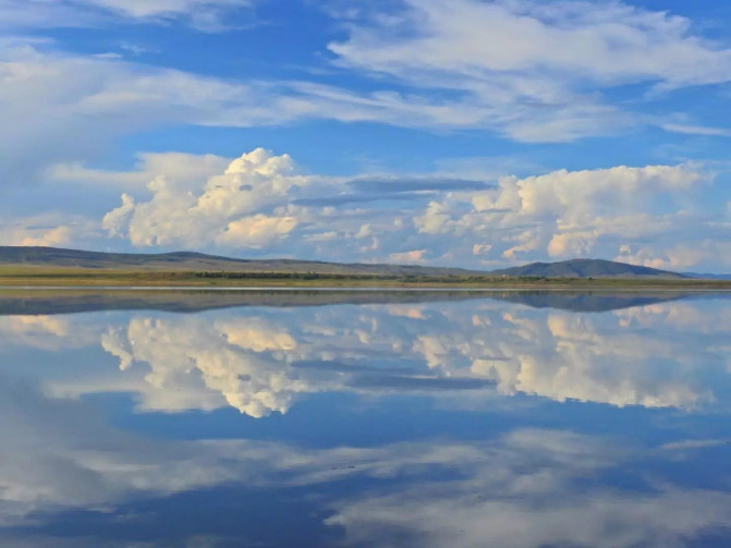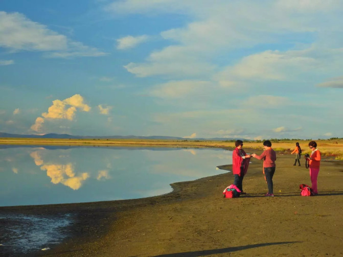 汽车飞驰地开过,而这颗蓝色眼泪在阳光的照耀下变换着色彩,或因水蒸气笼罩幻化出一片迷离的梦幻蓝,或因微风轻抚荡漾出一片绚烂的深邃蓝。偶尔几只西伯利亚红嘴鸥从湖面一跃飞起,架接起这天与水的对话,直叫人感叹这大自然的神来之笔。