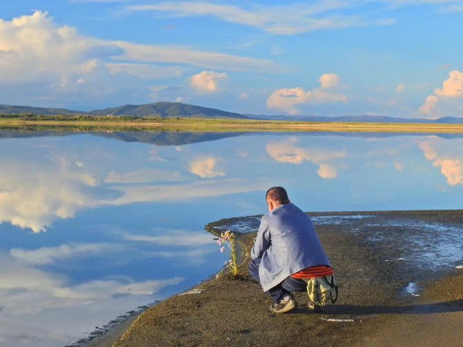 站在船上,我就静静地凝视着,落日的余晖洒满了整个湖面。这个曾经苏武牧羊的流放之地,这颗绝美的蓝色眼泪,轻易地唤起了内心深处的某种情结,有一天,和爱的人,就在这片湖光山色之中隐居,过着岛上人们简单的生活。不需要网络,不再有生活压力,就这样伴着湖泊日出到日落,生活总归于平静。