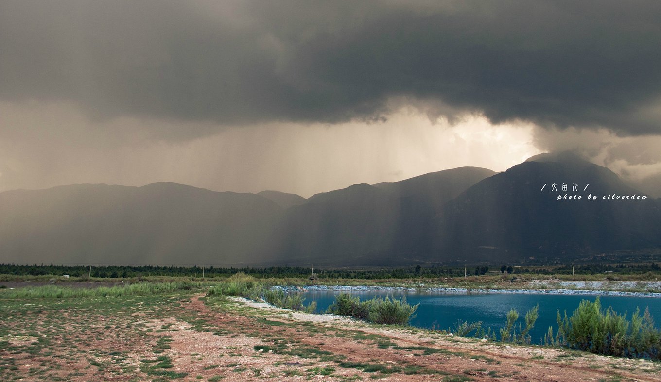 到达湖边的路一定要小心,草坪之间已经出现在断裂,千辛万苦,终于走到湖边,也不知道该说不巧,还是巧了,又遇暴雨,满天的乌云暴雨,让整个文海失去了色彩,于是坐在湖边的枯枝上赏雨,湖水由湛蓝色变成了灰色。