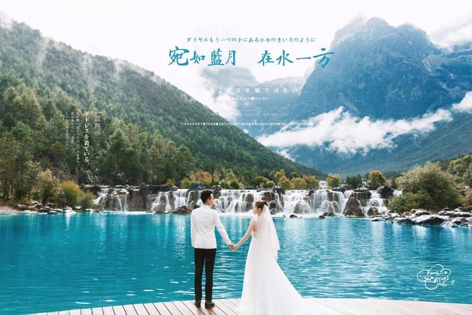 从云杉坪下来,我们就到来拍主婚纱的地方——蓝月谷。 蓝月谷在晴天时,水的颜色是蓝色的,而且山谷呈月牙形,远看就像一轮蓝色的月亮镶嵌在 玉龙雪山脚下,所以名叫蓝月谷。
