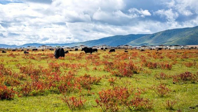 在大自然面前,人类该多渺小啊~ 稍作休息之后我们继续出发,前往风景秀丽的小中甸,欣赏美丽的高山狼毒花花海。 步入初秋,草原上生长着火红色的狼毒花。