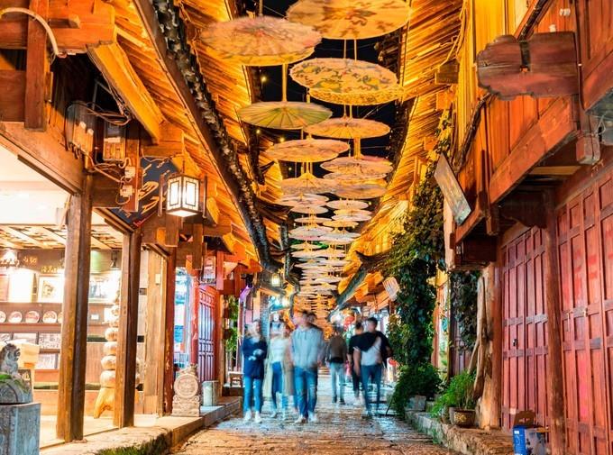 在客栈屋顶上俯瞰整个古城,静谧的古城似乎把时间停驻了。 八点的 丽江 ,夜幕开始降临,古城像换了张脸,变得热闹非凡。 四方街旁边的巷子之一,上面挂满了各种油纸伞,夜晚的灯光照耀下很有古时候的感觉,而下面来来往往的现代游客却并不冲突,反而是完美的融合。