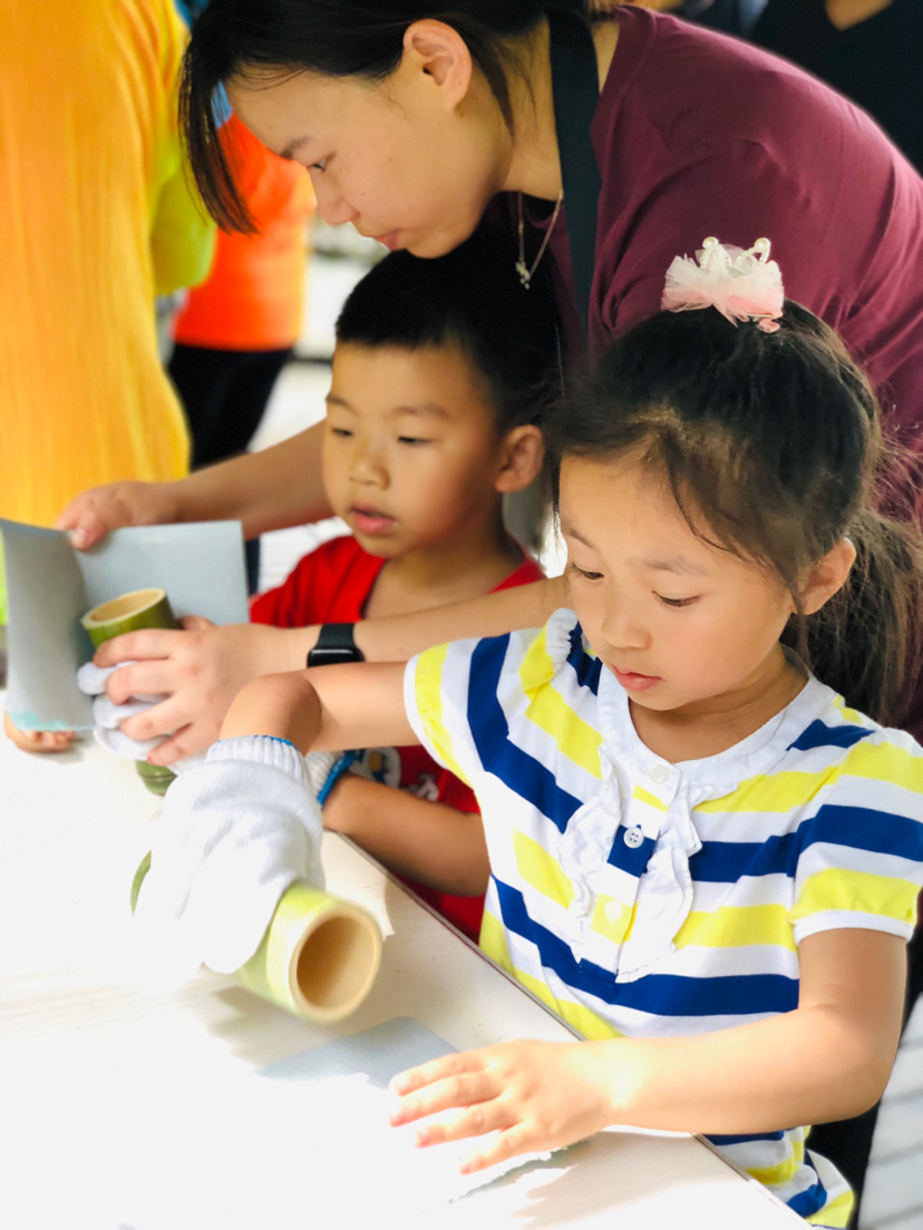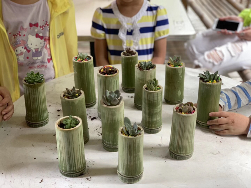 玩过四驱车后开车到鸬鸟房车露营公园,在营地老板的带领下,我们用小竹筒制作了多肉盆景。