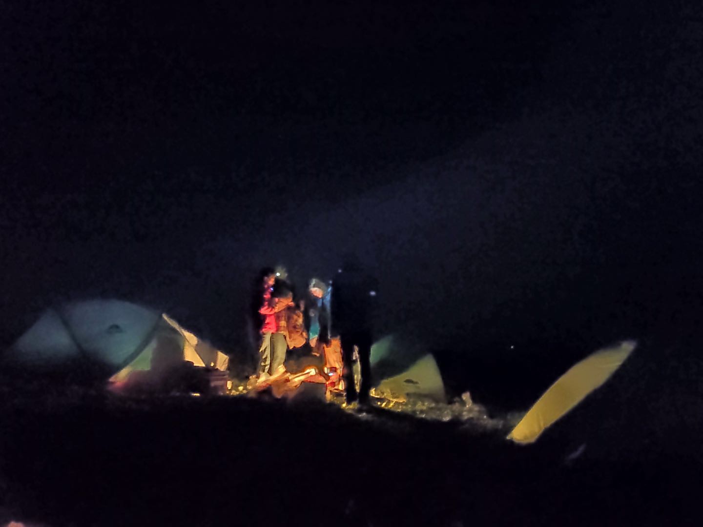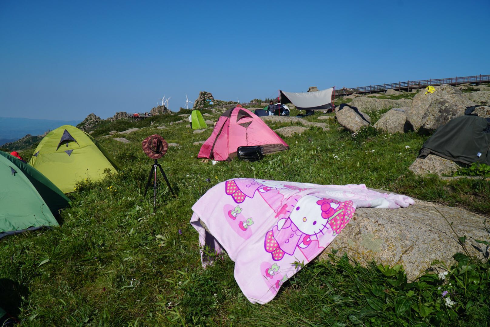 景区旺季有人收费,山下大门被挂起讨薪条幅。车开到山顶,有一条长长的栈道上到露营区,大家随意搭帐篷,草坪上、石头上、观景台上、小亭里。古冰川遗迹毫无保护,大家随意攀爬。景区随处都是牛粪,非常原生态。没有厕所,没有信号📶(移动),联通还有3G信号。不过,就是这样的环境,大家一起玩的机会才多,体验一次真正的野外露营。