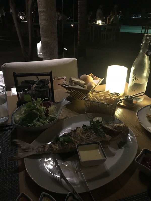 其实作为午餐好一点,本身HB不包午餐,这样就省了一顿。但是我俩约了转天中午到旁边的岛上BBQ, 就只能让他们把鱼留到转天晚上在主餐厅了,我们要了两条,一条烤,一条炸。