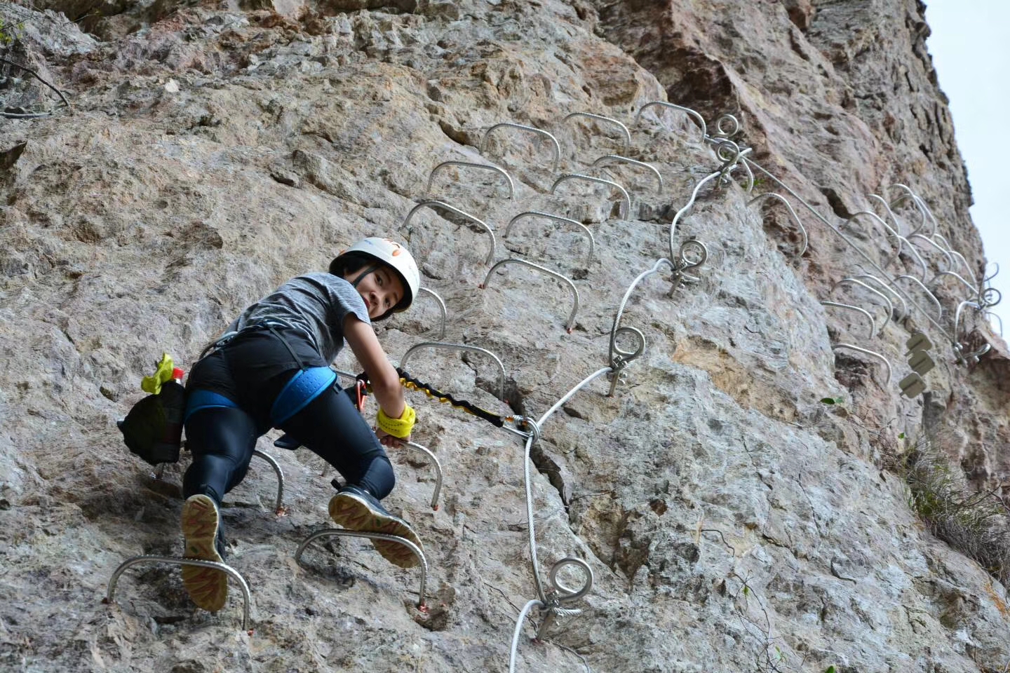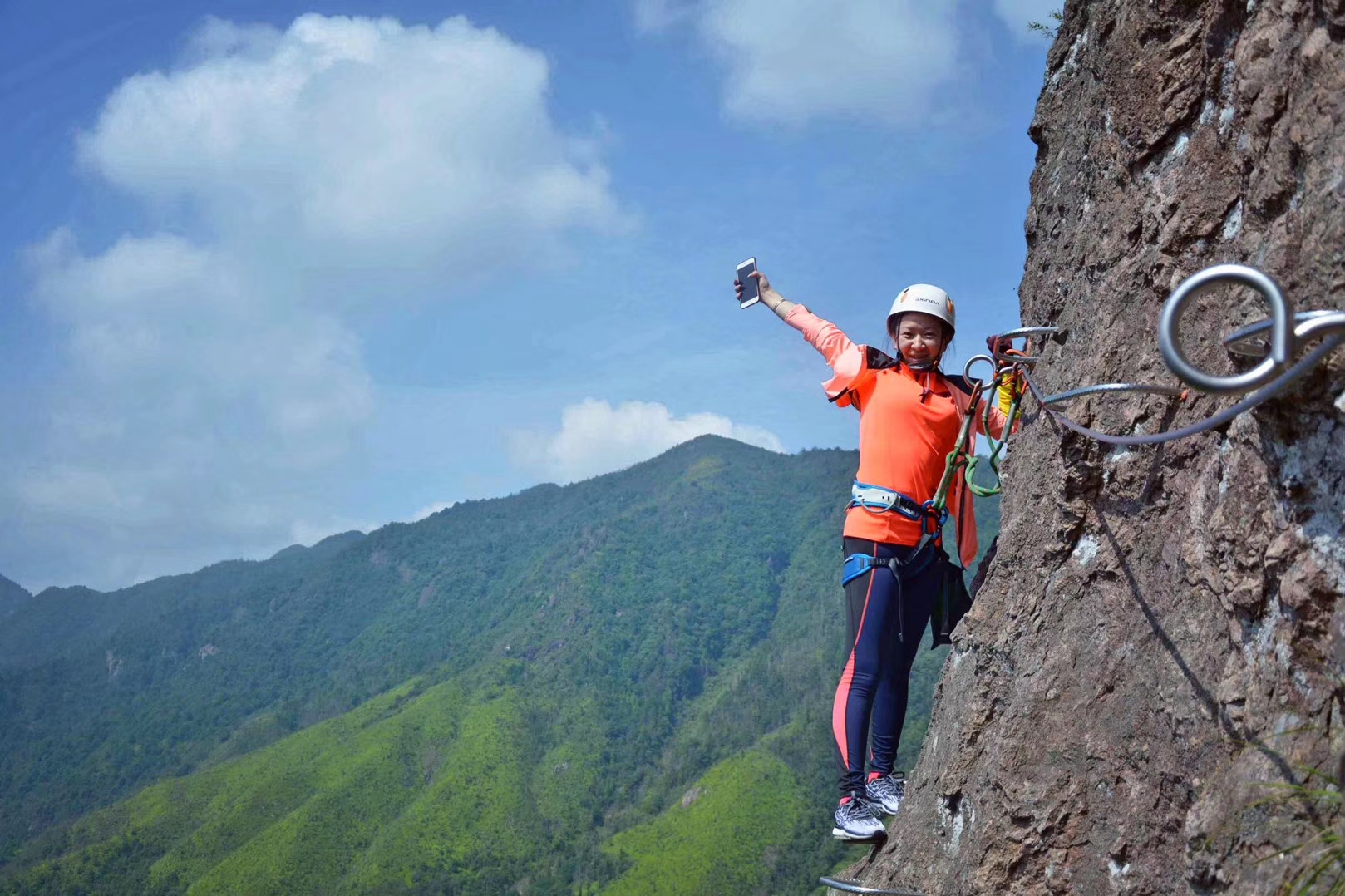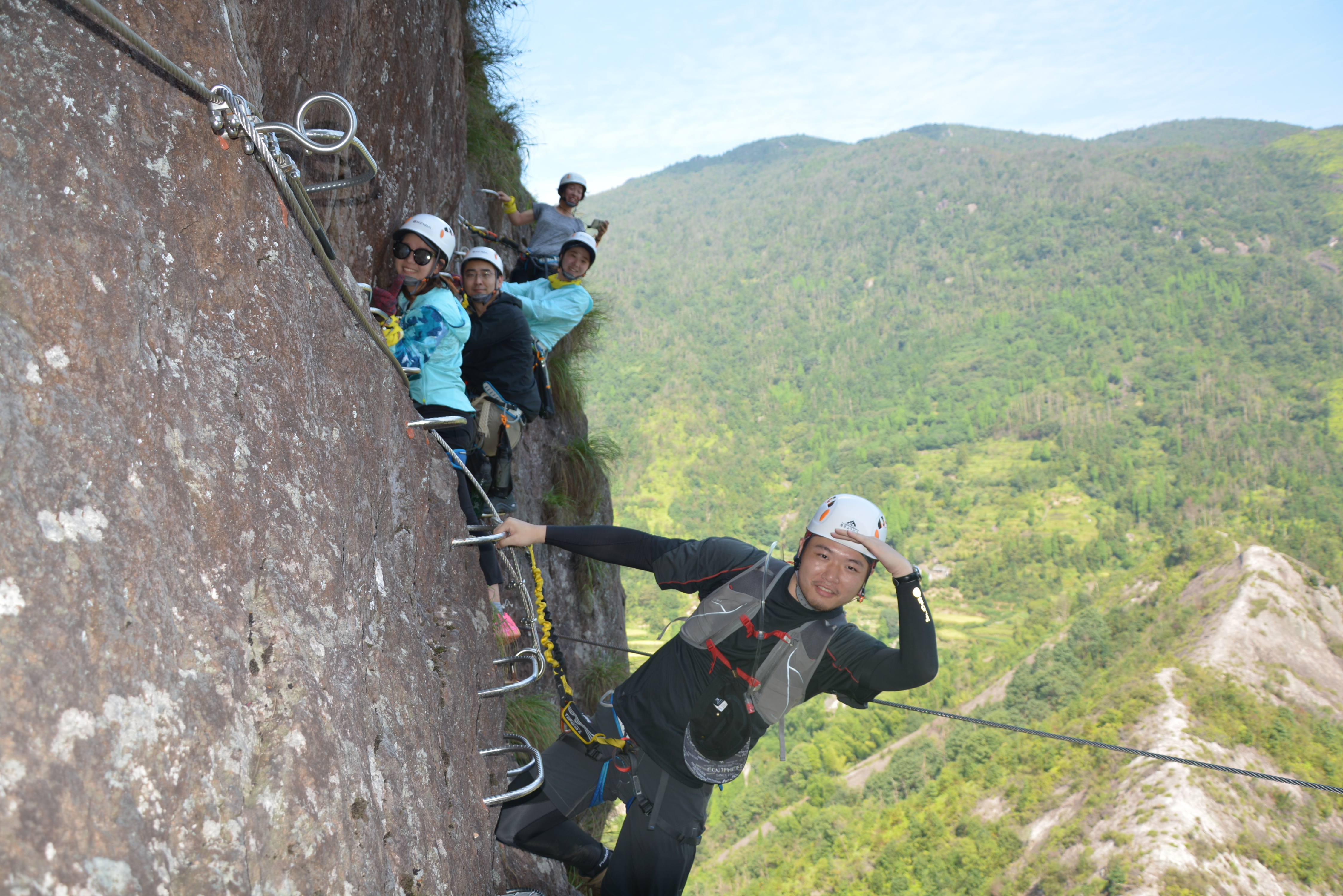 关于飞拉达的介绍一下引用百度百科的一段话:飞拉达是意大利文(Via Ferrata,意为岩壁探险或铁道式攀登)的音译,英峭壁之上文则为Ironroad ,指的是在山面上建设,由铁扶手横梯、固定缆索、岩石塞、踏脚垫等构成的爬山径道,让爬山者不会攀岩也能攀上陡峭的岩壁。