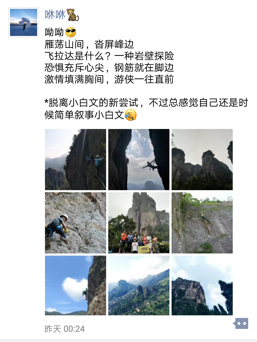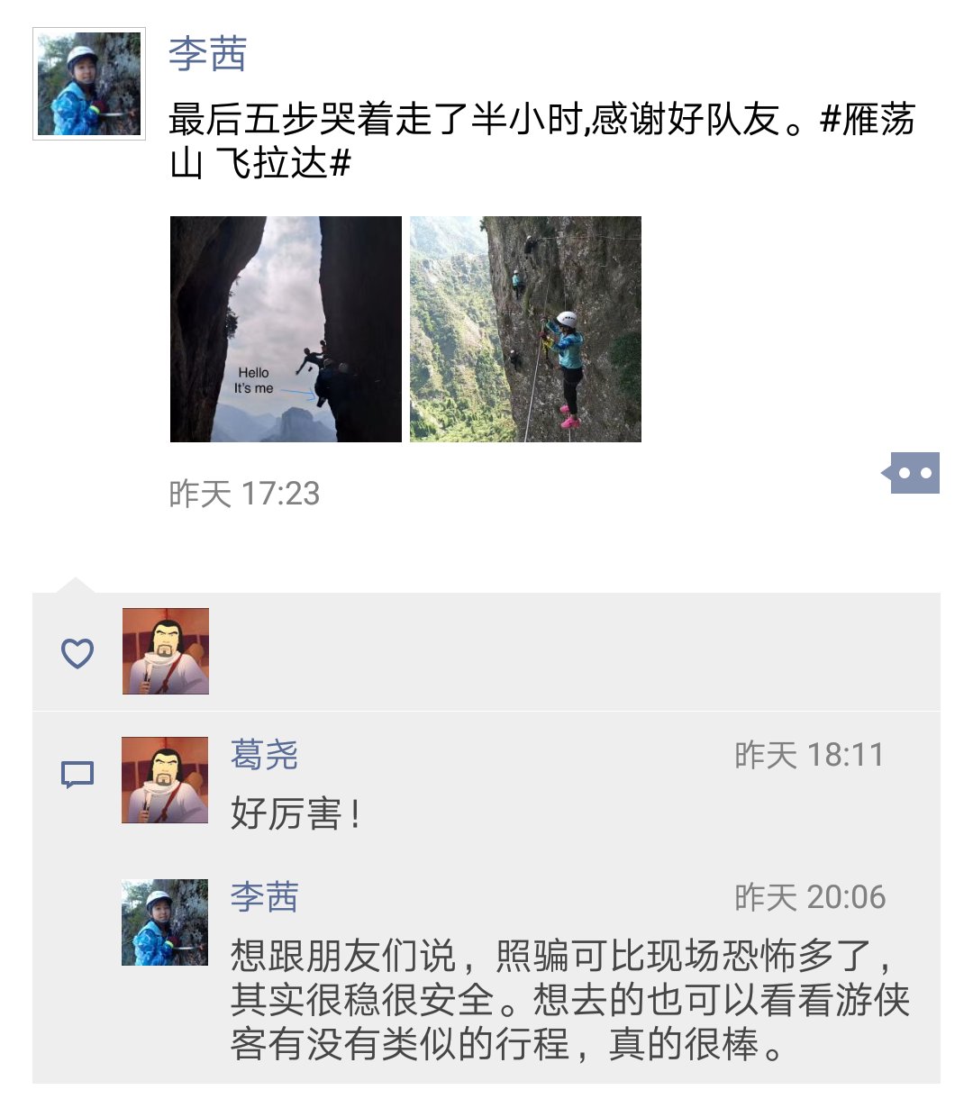 大爷的春天:大家好,给大家介绍一下,这是我心心念的飞拉达,我可以激动很久,此次全程几乎木有拍过风景,只有挂在悬崖上的舞蹈。@所有人