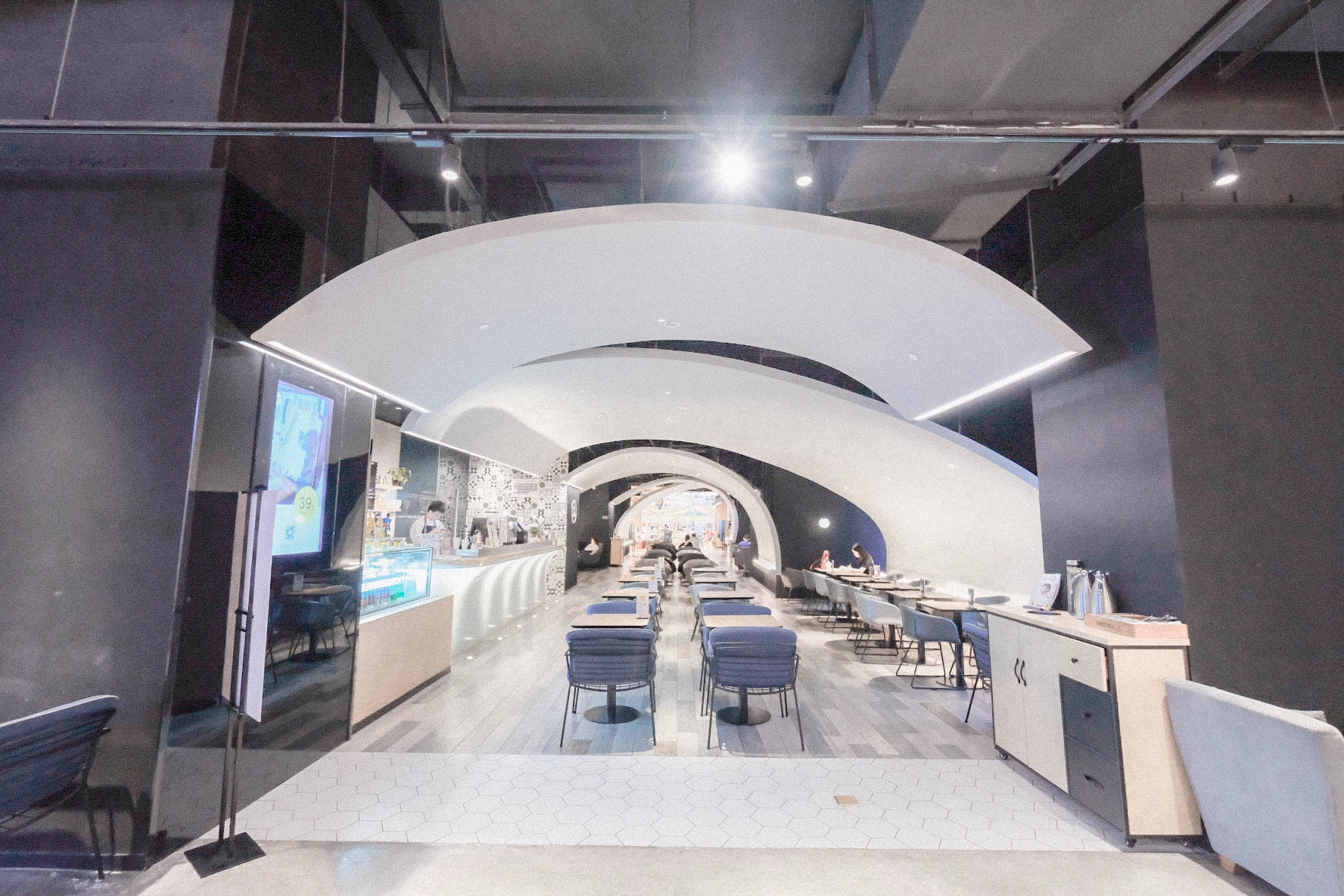 活动演讲区在书店中有一处完全独立的空间,水泥砖搭砌起来的弧形背景墙,顶部却是数码感很强的几何天花板。