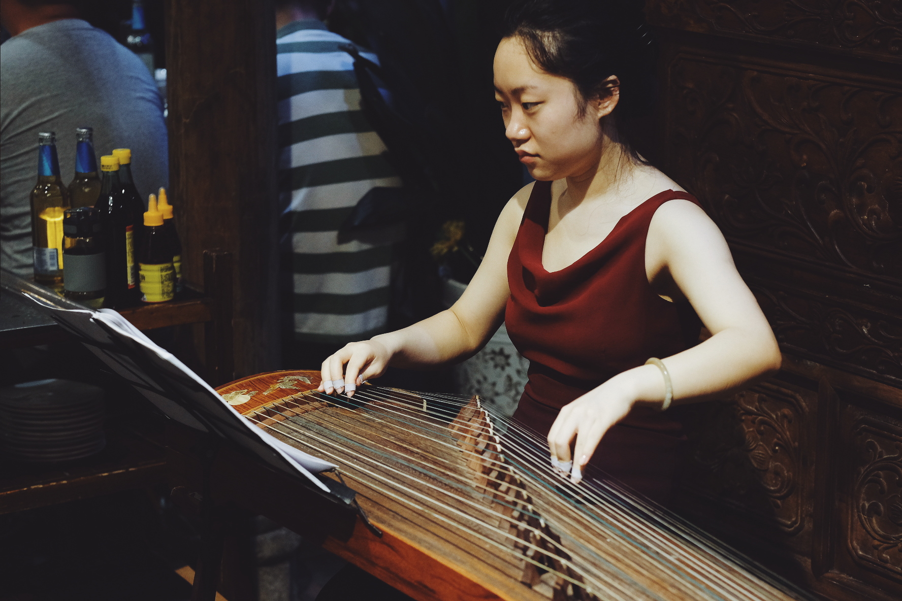 亭中弹着古筝的姑娘面容清丽,筝音生生入耳撩人。