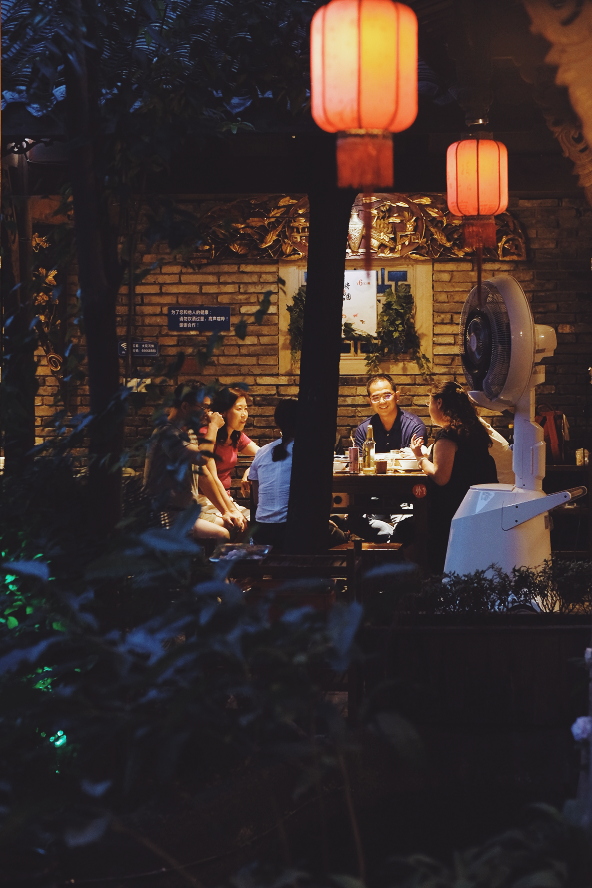木质桌椅,亭台楼阁,小桥流水,吃火锅不再是热火朝天、众声喧哗的画面,更是趋向于悠然自得的场景。对了,到了傍晚这里还会亮灯,在用餐的时候潭水经过精心设计还会放出水雾,像在仙境中用餐。