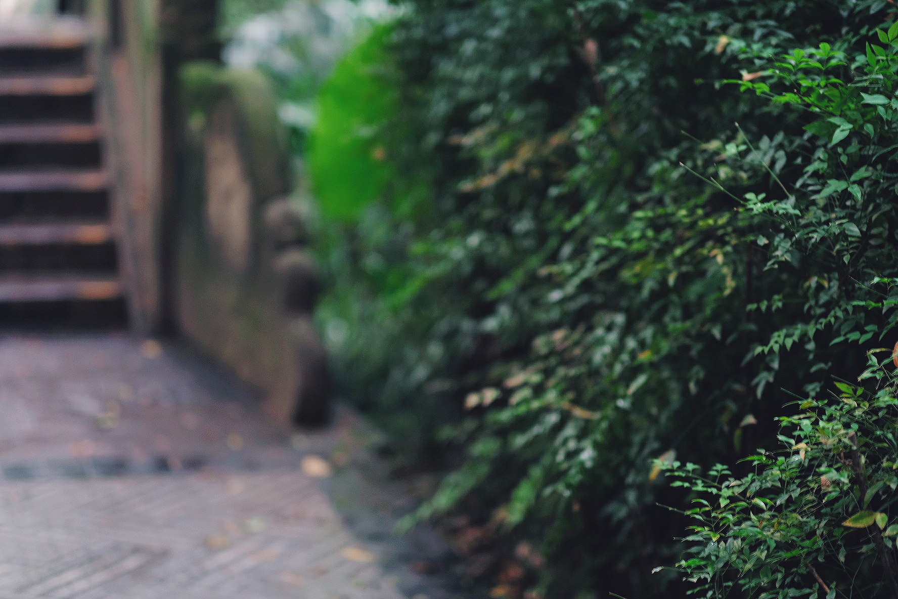 窄窄的过道旁,刷有奶白色的墙面。脚下踩着的青砖与屋顶的黛瓦相映成趣,木质的棕色门面与随处可见的绿色树林让人能在自然之中寻觅到一丝惬意。