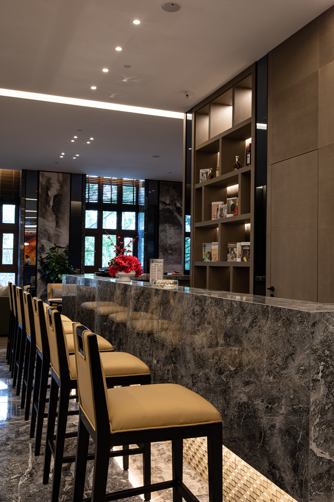 走进去,你会看到大厅中央有圆柱形的灯柱,里面陈列有茶具等小物品,在灯光照射下,这儿显得很独特。