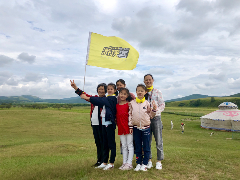 夕阳西下,照得整个草原暖洋洋、金灿灿的,为我们游侠一家的合照添上了温暖的色彩。