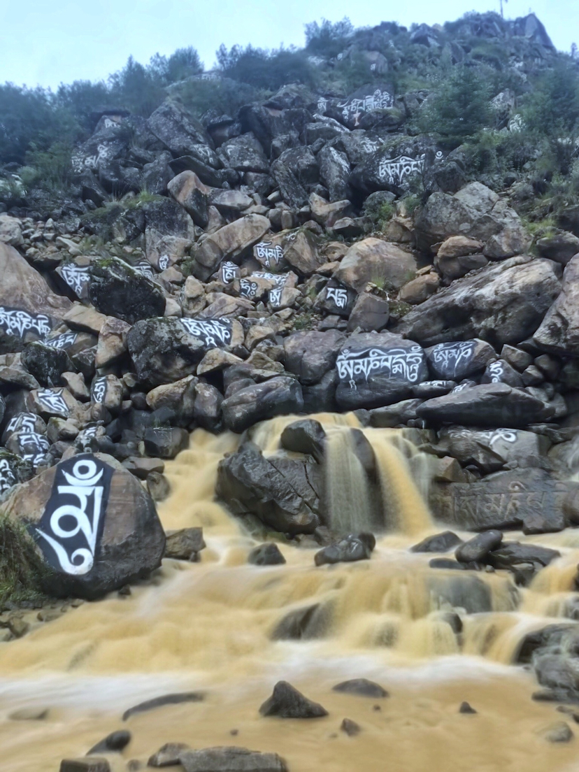 在从塔公到新都桥的路上,要经过一条河谷—堆满了玛尼石。河水流过玛尼石,“六字真言”就随水流淌。这是一条流淌经文的河谷。