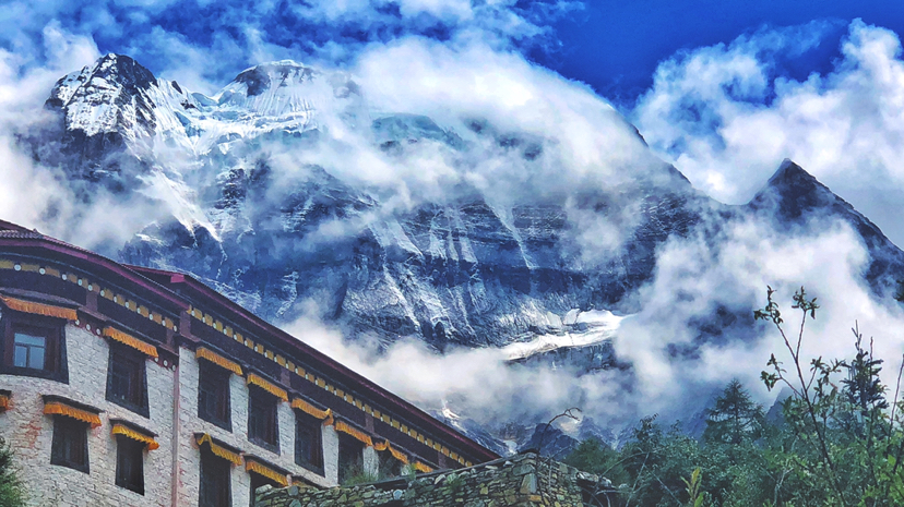 入眼的是映衬在蓝天祥云下银白色的山峰。这里有着与世无争的和平安宁,让人们只愿长长久久地留在这里,远离喧嚣和纷扰,伴着神山,享受阳光,感受宁静。