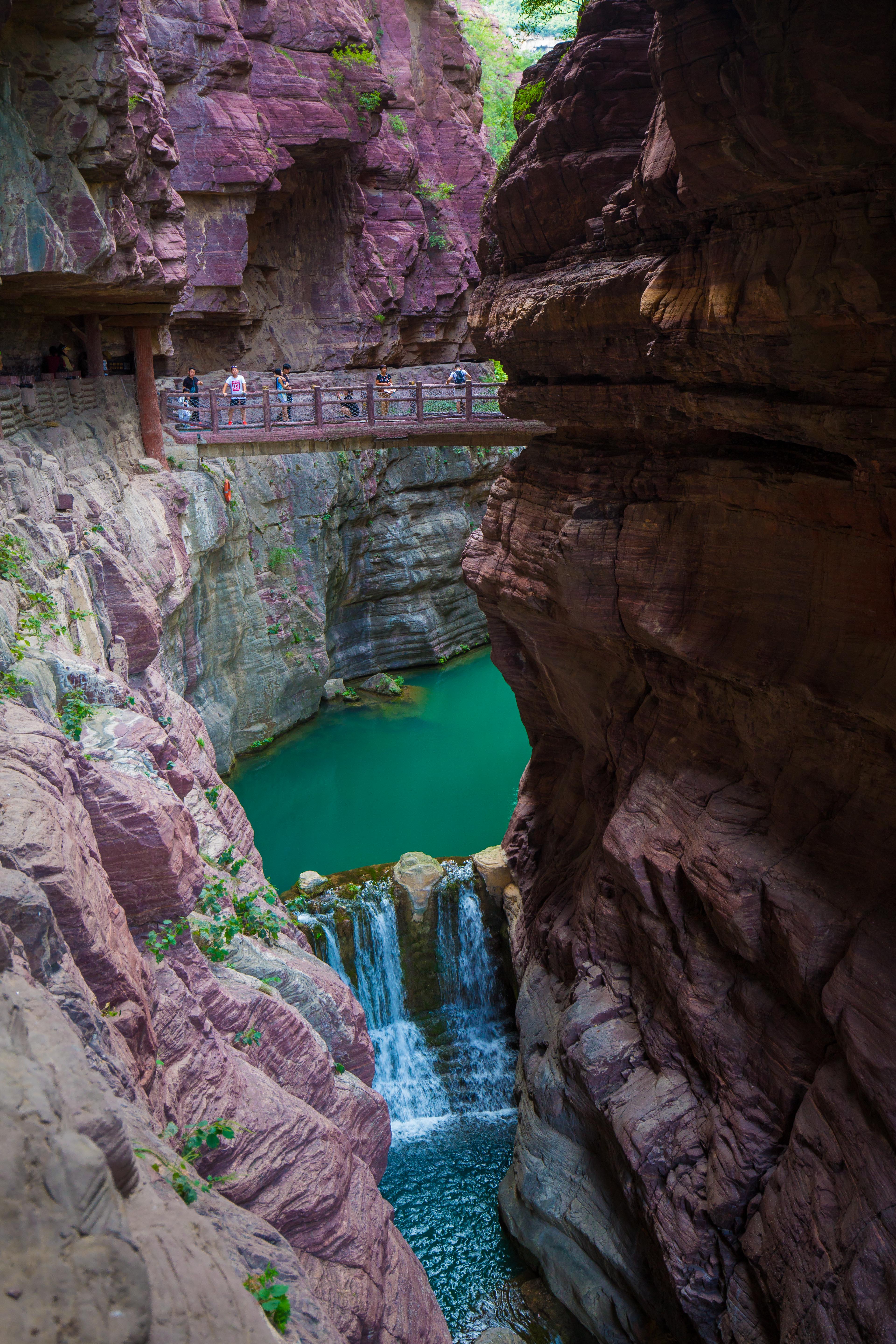 徒步潭边,至幽至奥,碧绿的潭水映衬着朱红色的山体,山间落下银丝的山水,柔骨情长,透出的明丽鲜艳的 奇景,怎不让人心动。