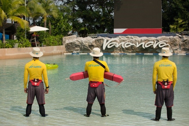 华欣哇呐呐哇水上乐园被称为泰国最安全的水上乐园,游玩前称重只是一部分,在人造沙滩边也可以看到救生员时刻在待命,而且进行滑水道的时候,如果你穿的泳衣上有铁扣的话,他们会给你胶带把露出的部分包好,以防伤到。所以安全等级还是很高的,据说还是美国最严格的国际安全标准和救生员规定,所以完全不用担心安全性。