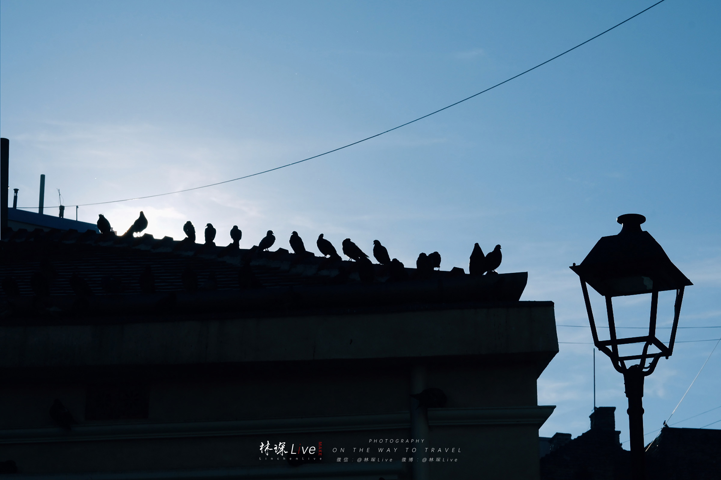 逆光拍摄站成一排的鸽群剪影特别好看,有种静态的唯美感。