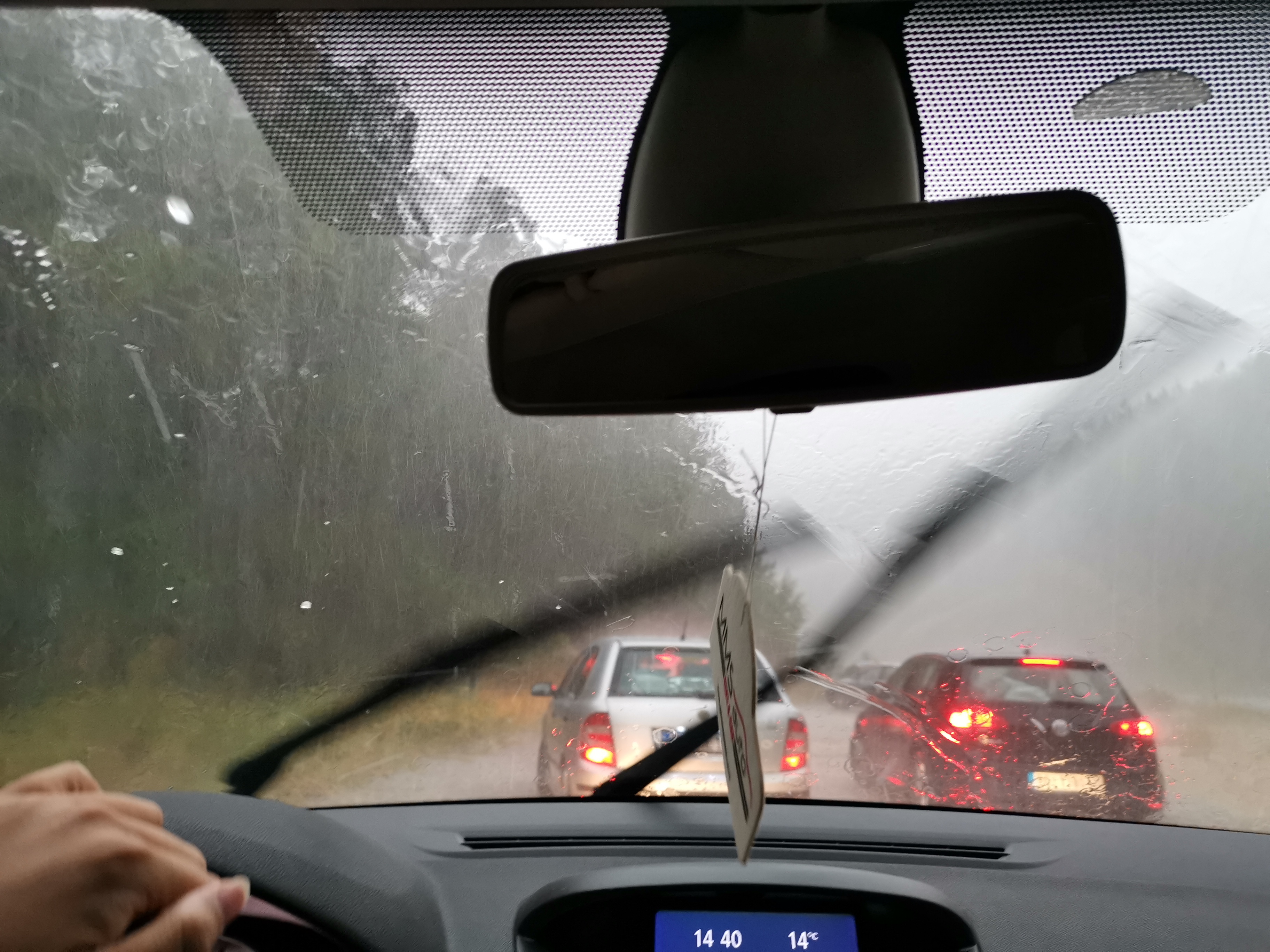 一开始我们缓慢前行,后来冰雹越来越大,雨也越下越大,只好被迫停靠路边。