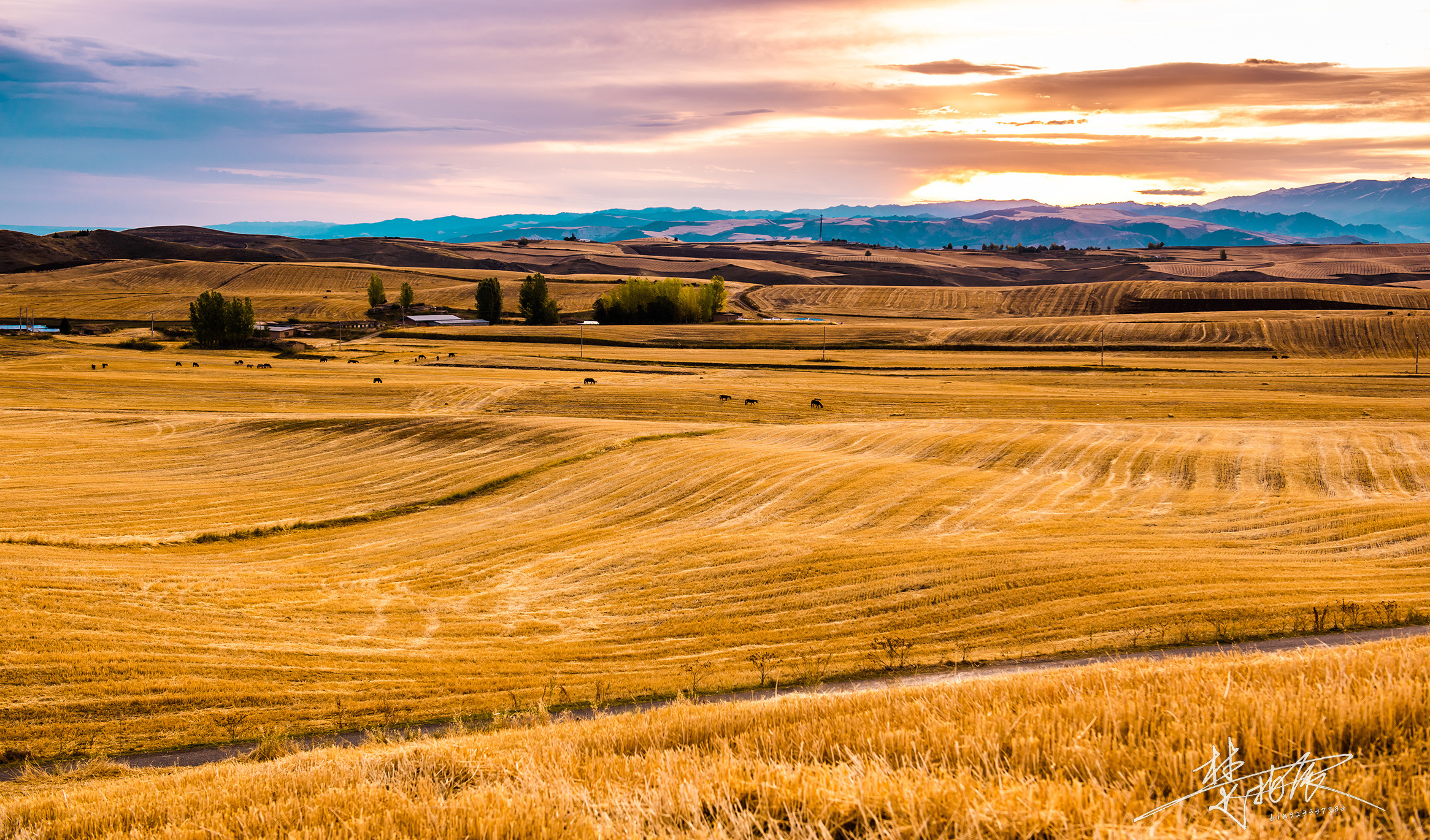 这是一个丰收的季节,纵横起伏的麦田刚刚经过了收割,留下的是一道道纹理感很美的麦茬。