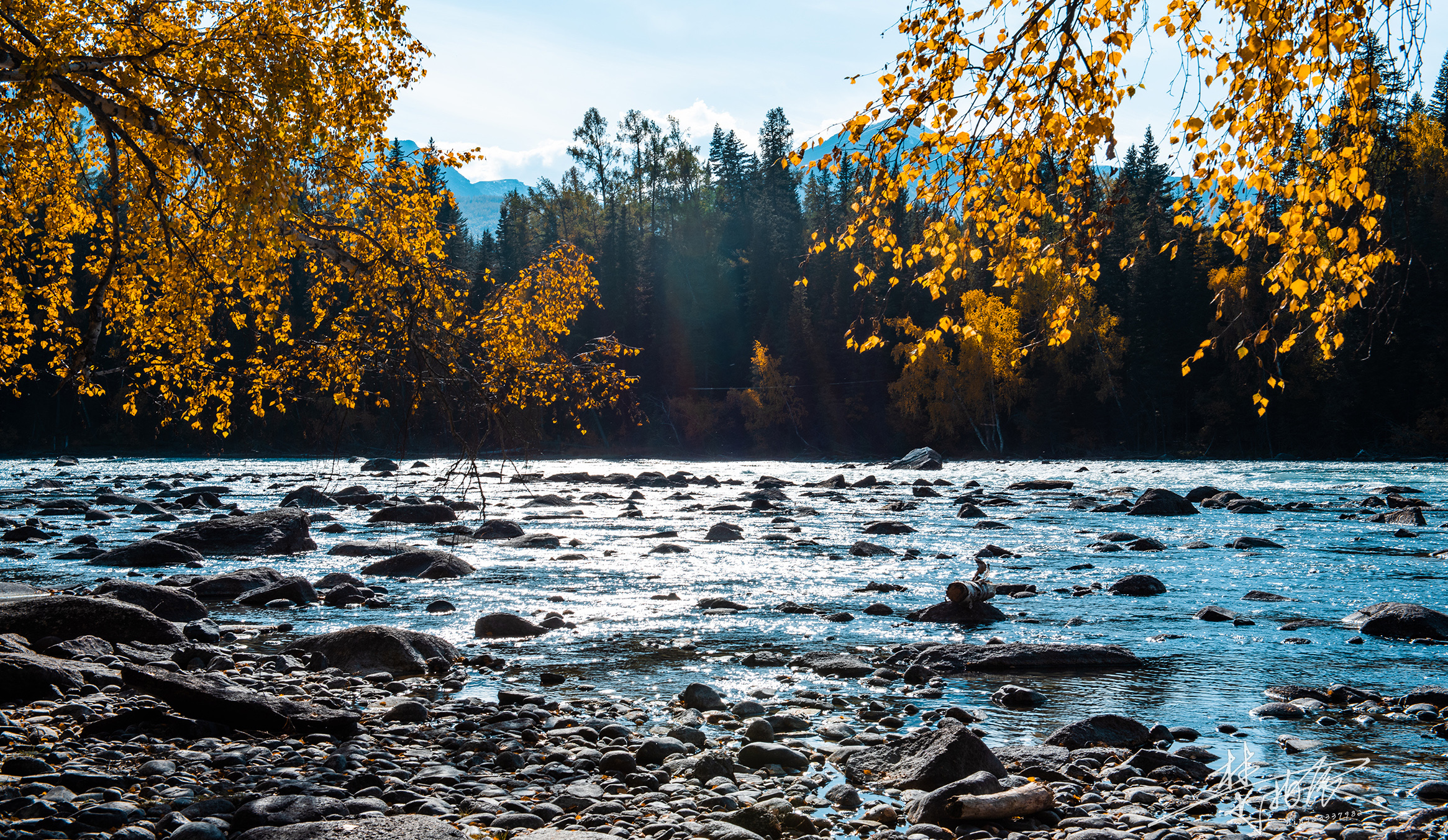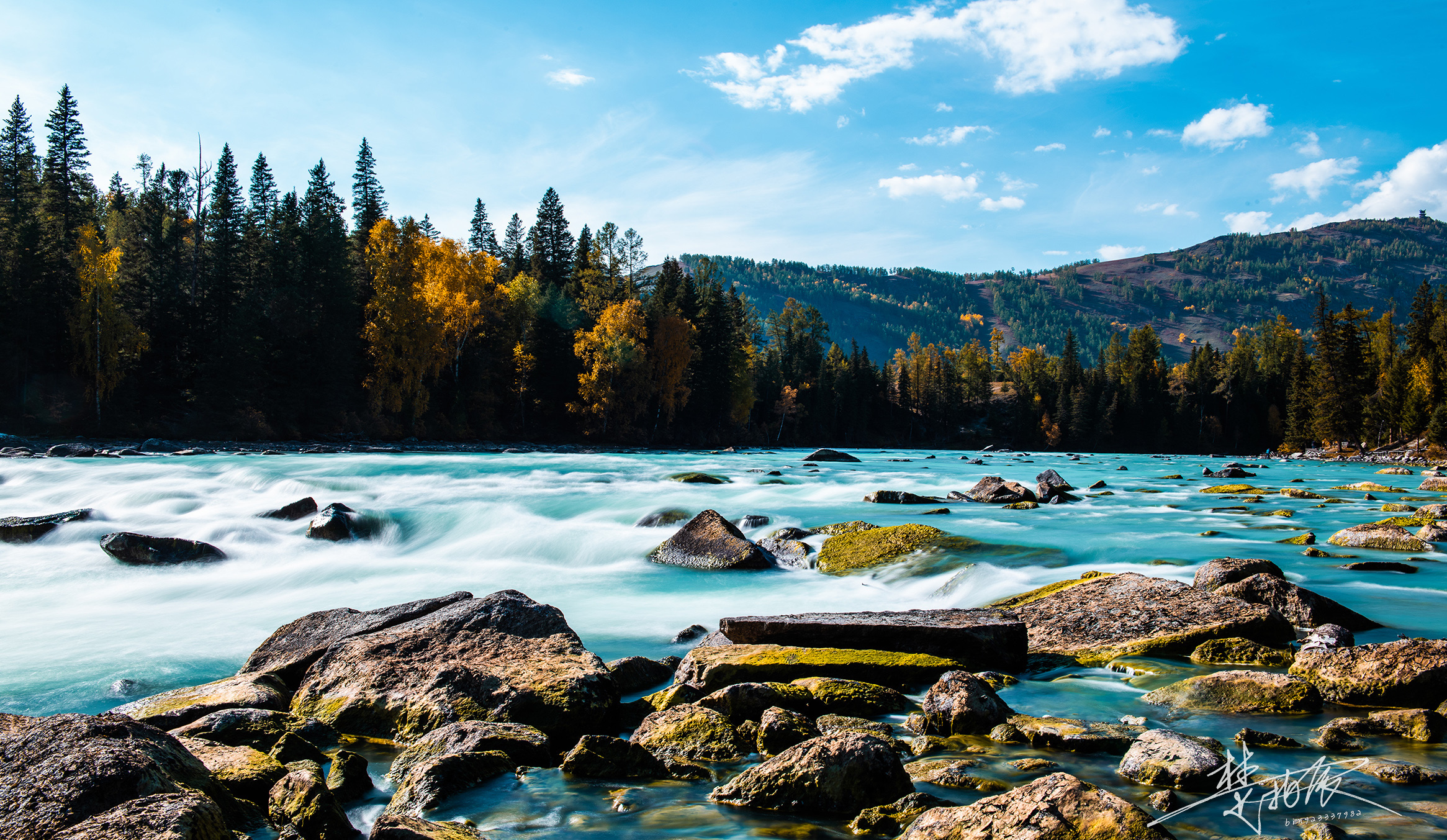 秋季的喀纳斯湖水位下降了一些,礁石露出水面,湖水顺着低洼处倾泻而下,水花拍打在礁石上,一个粗糙坚硬,一个柔软缠绵,形成强有力的对比,这是我们非常喜欢拍摄慢门的条件。