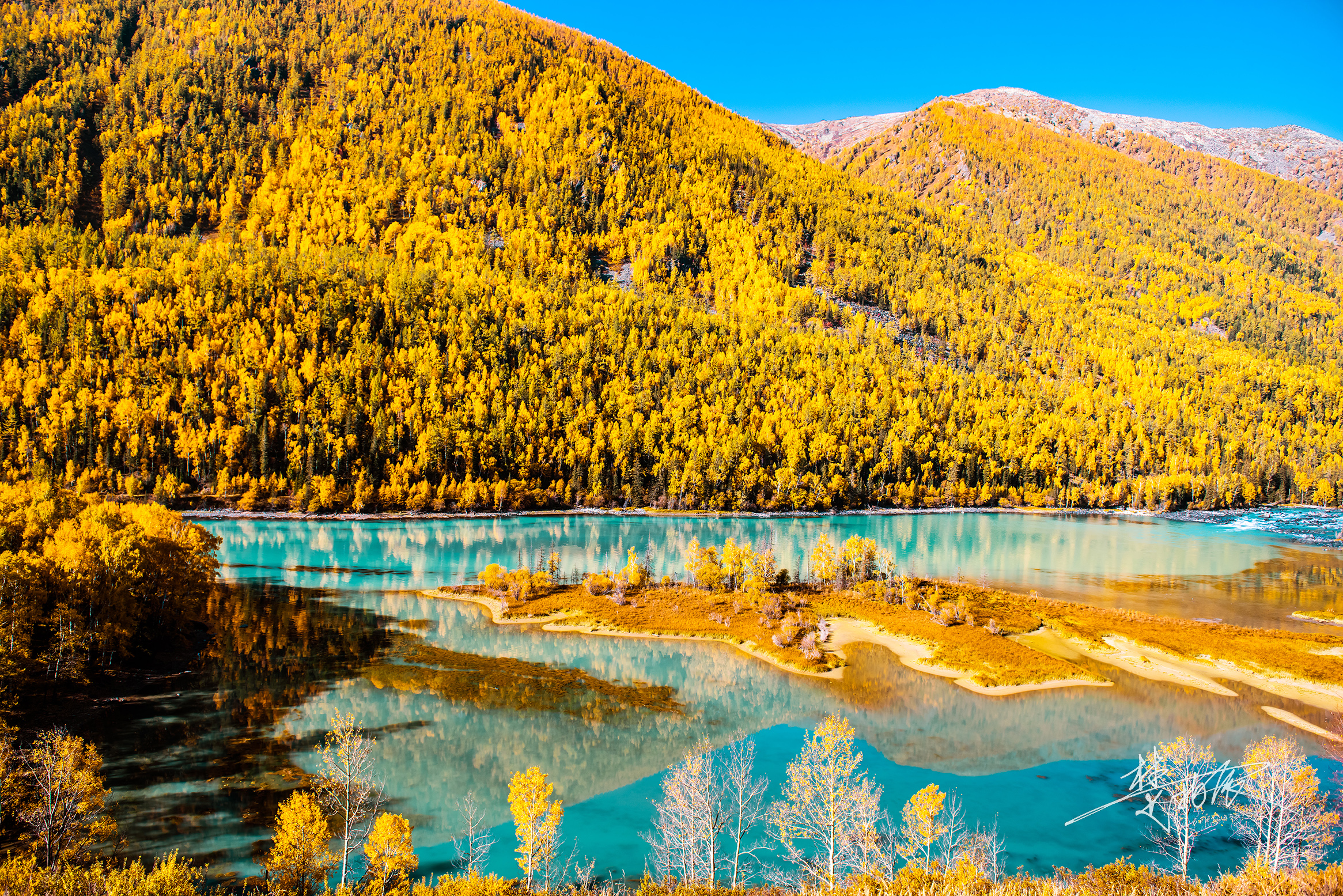 喀纳斯的湖水因富含矿物质元素,水色呈翠绿或翠蓝,与天空遥相呼应,秋雨还没有让这里的树木全都变黄,但也正好色彩显得更为丰富。
