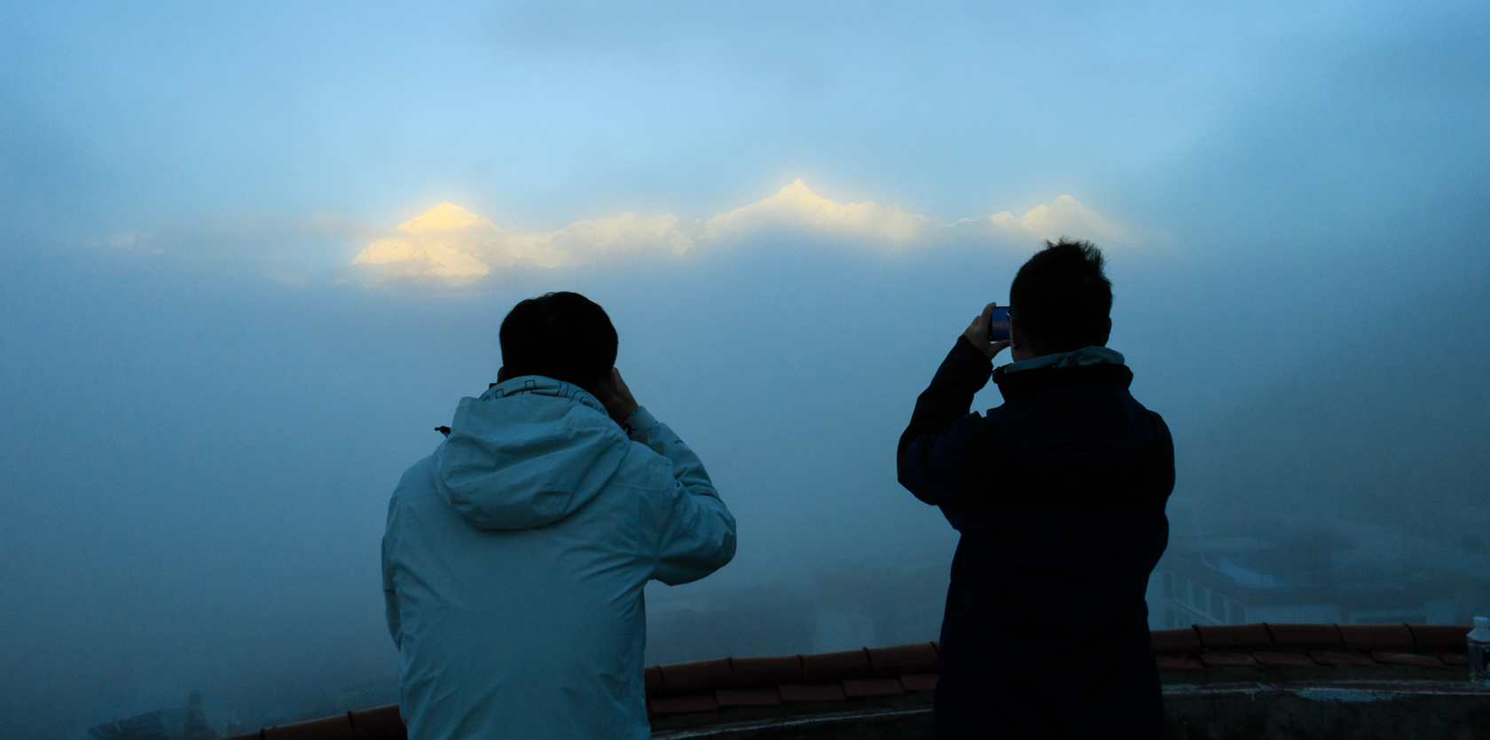 早上6点半起床,透过窗户可见蓝色的天空影衬下的梅里雪山。稍后,上酒店楼顶守候“日照金山”,云雾却越来越浓。接近日出时分,还是无望的样子,便回房间收拾行李。刚回到房间,同伴打来电话,说“来了”。复上楼顶,当清晨的第一缕曙光点亮主峰卡瓦格博的最高点时,金字塔状的主峰开始自上而下被慢慢染红,卡瓦格博如英雄般被披上鲜红的斗篷,与传说中一样英俊魁梧。而最南侧的缅茨姆峰是传说中主峰卡瓦格博的妻子,她的形状形似主峰,却又多了一些俊俏婀娜,此时也被轻轻点亮。她的脚下,便是此行我们真正的去处——雨崩。