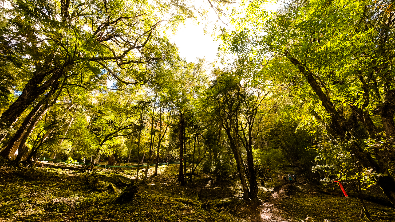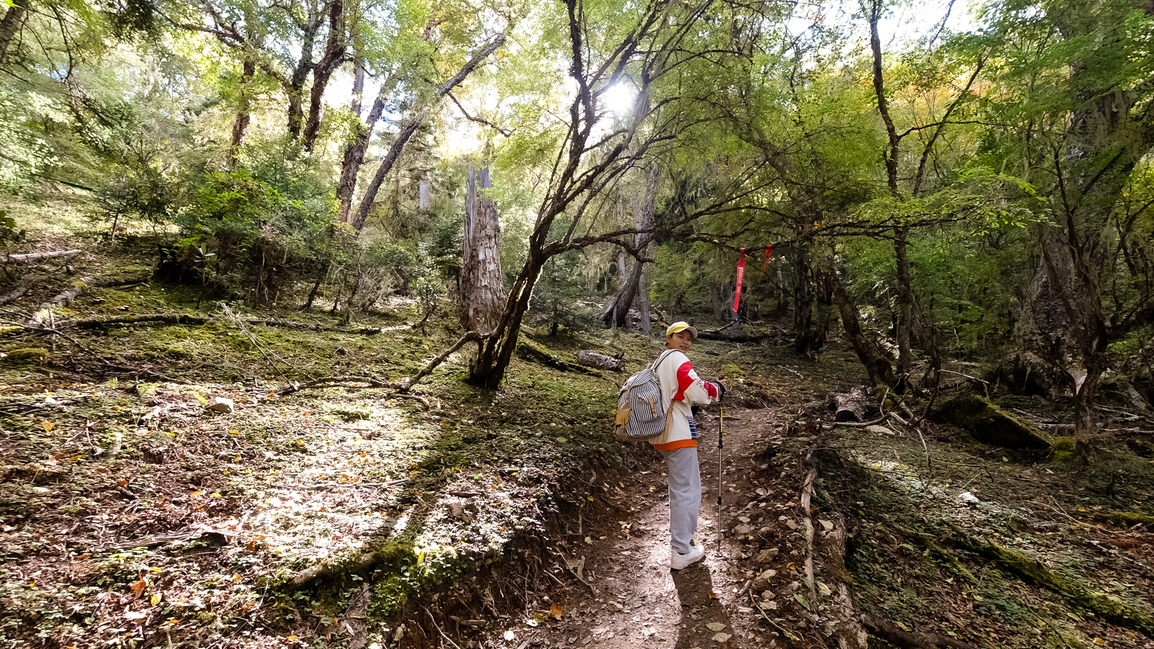 半个小时后继续前行。此时已是下午3点一刻,西下的阳光斜洒下来,在林间显得更加线性,树木更加泛黄。
