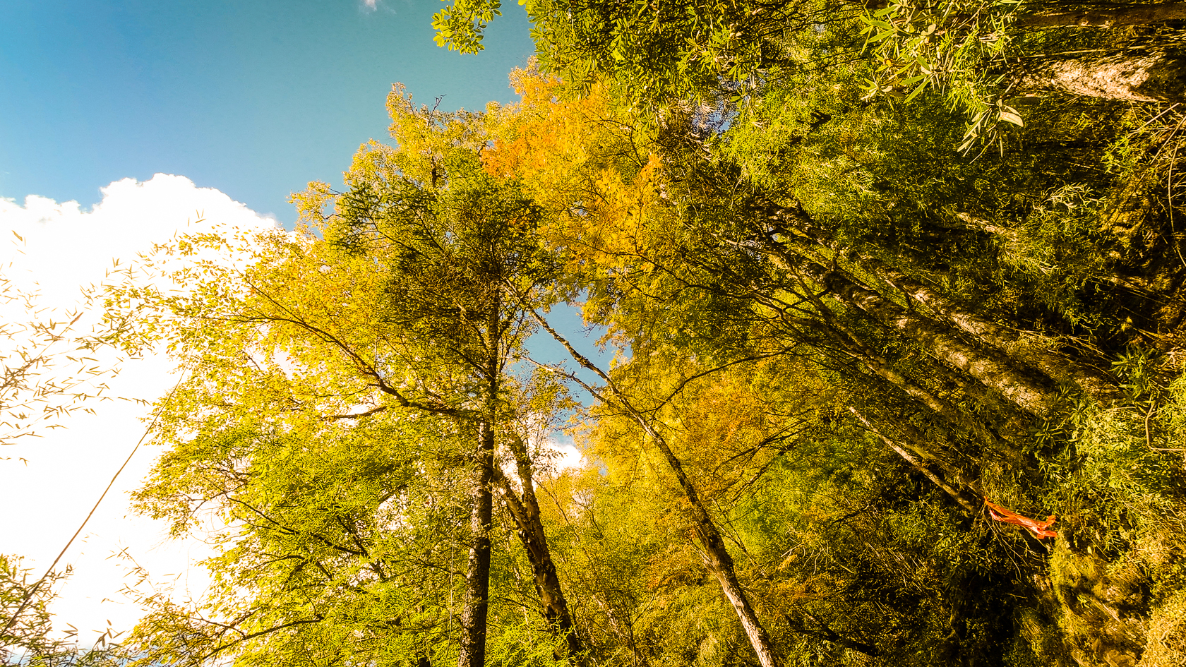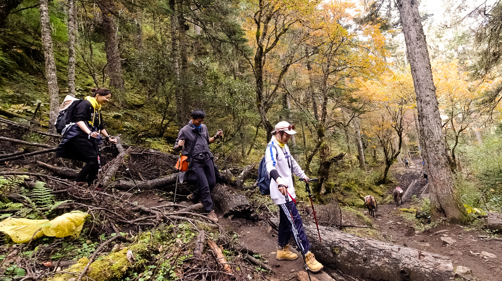 渐渐远离雨崩村,行在通往神瀑路上,这段路是上行缓坡山路,相应好走一些,周围原始森林覆盖,海拔在3000以上,此时,秋色正浓,装点着我们徒步道路上的风景线。