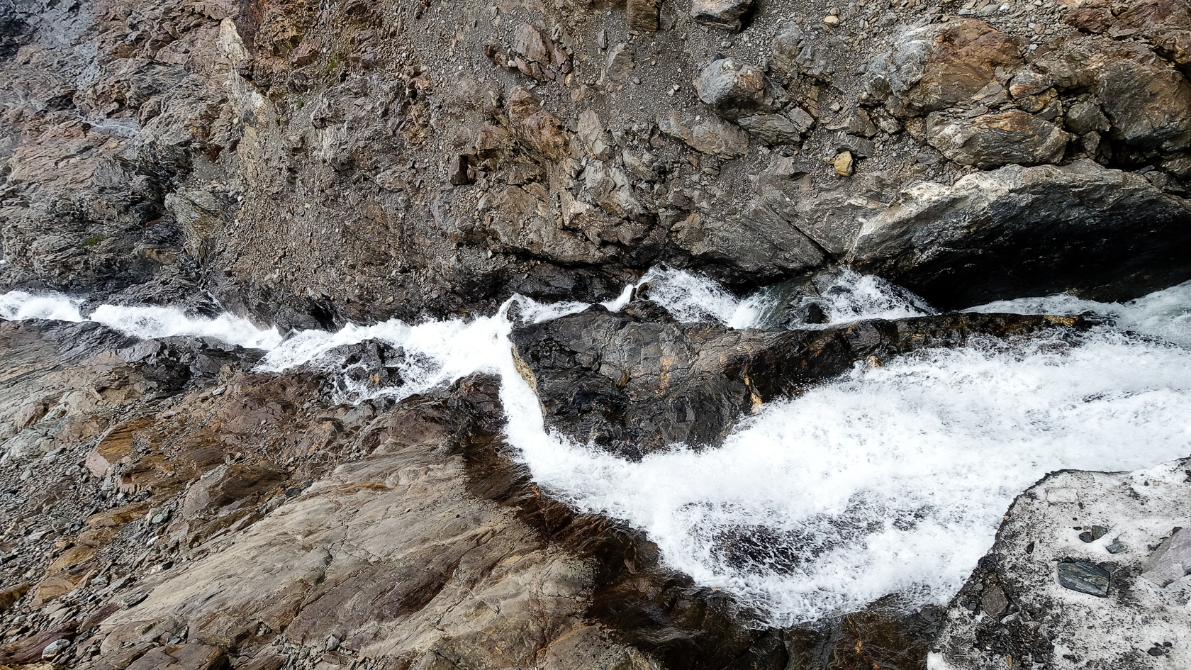 还没到湖畔,先找到一个小空地,无人机升起,整个冰湖一览无余:高高的卡瓦格博神山之下,冰川融化的雪水分成几缕瀑布飞流直下,注入冰湖。冰湖的下方有一出口,水流由此下泻流出,便是下面的笑隆曲河,在雨崩与神瀑河汇合后流经尼农峡谷,便成了雷霆万钧的雨崩河。