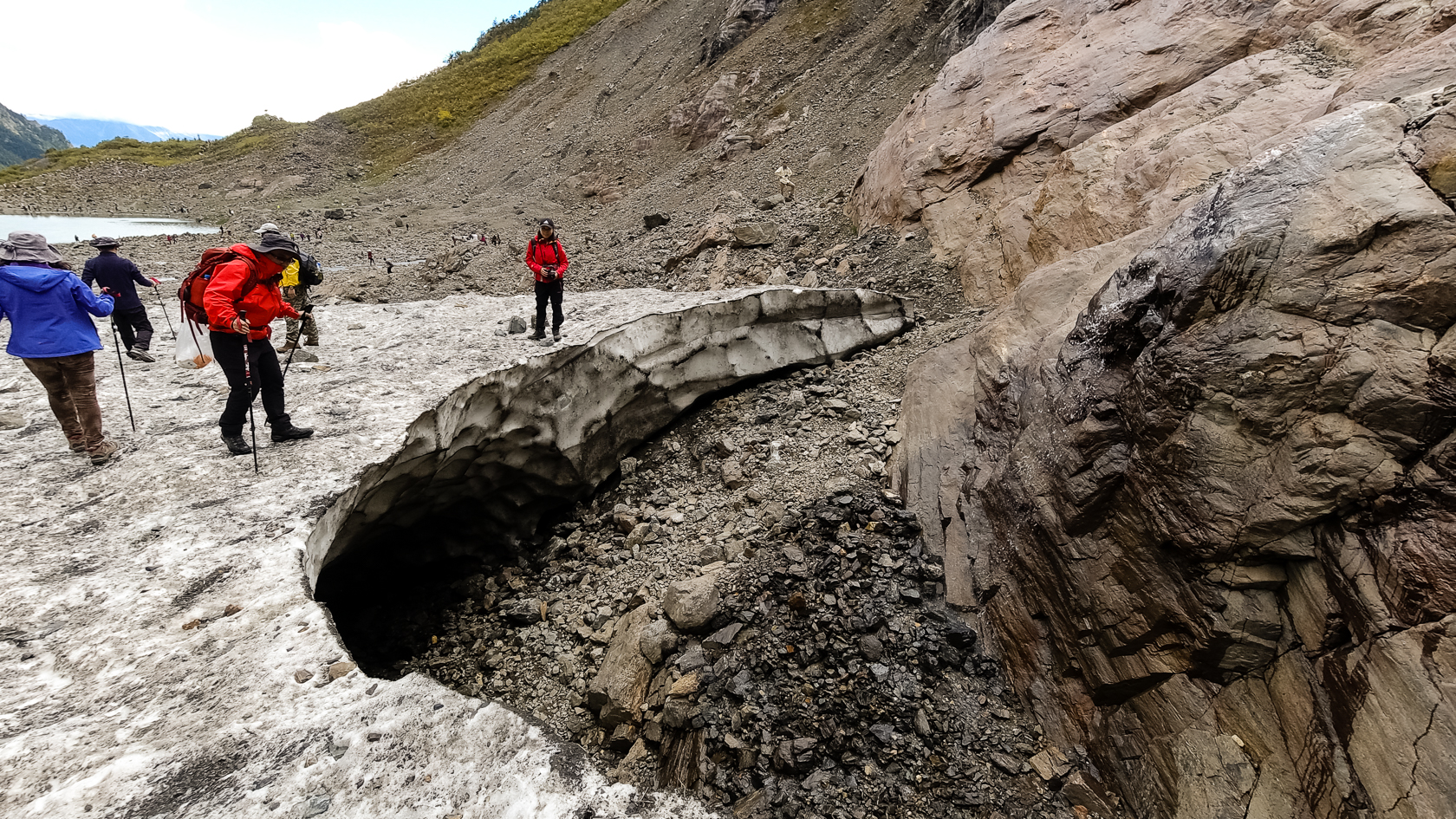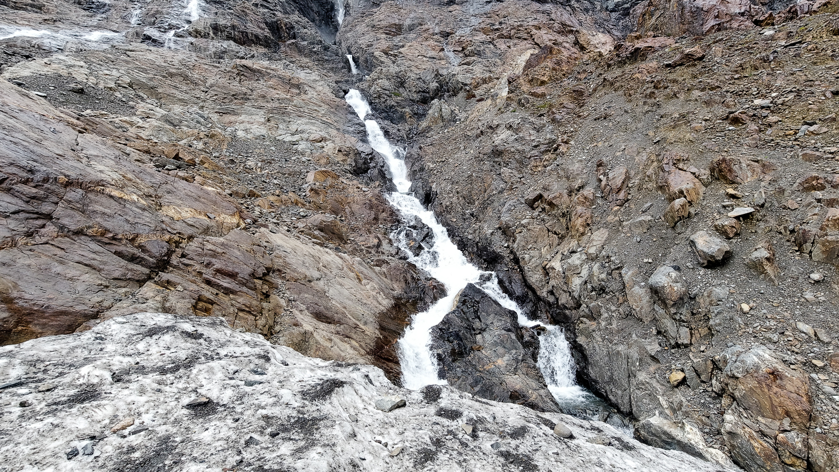 收下飞机后下到湖畔,又是另一番光景。能如此亲近圣湖,不禁让人心动不已。淌过飞流雪水,走近瀑布,仿佛灵魂都被净化。瀑布下端是一层厚厚的冰盖,冰盖开了一个大口,大口里面是一个深深窟窿,从卡片瓦格博上面融化的圣水透过冰窟流向冰湖,流向雨崩河,流向澜沧江,流向印度洋.....