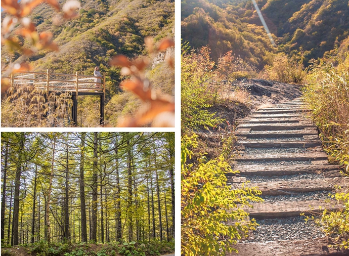 园区内的一条氧步道我最喜欢,全程1.5公里。深秋,步道上都是落叶,周边红叶正浓,这里是雾灵山自然保护区地域,所以森林植物非常繁茂,有少见的白桦林,枫树、蒙古栎,再往高处爬,会有云杉。