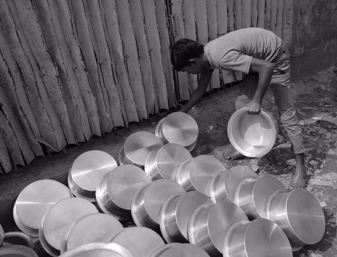 在达卡有个铝制品加工作坊较集中的地方,生产环境非常恶劣,环境的污染,光线的昏暗,机器轰鸣,却有很多童工在干这种工艺落后粗糙的制作铝制品。